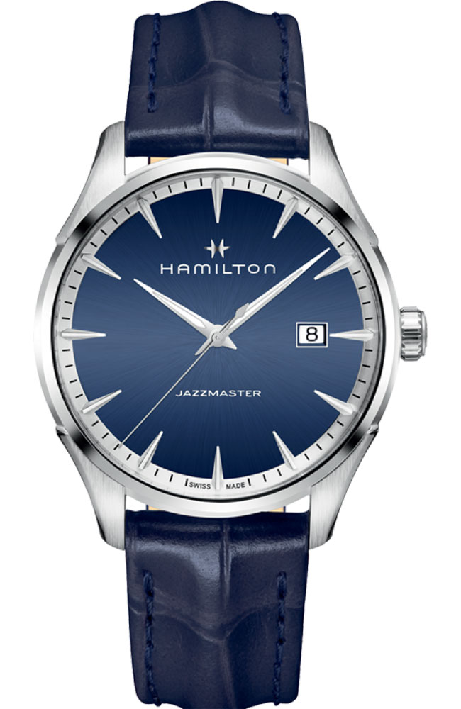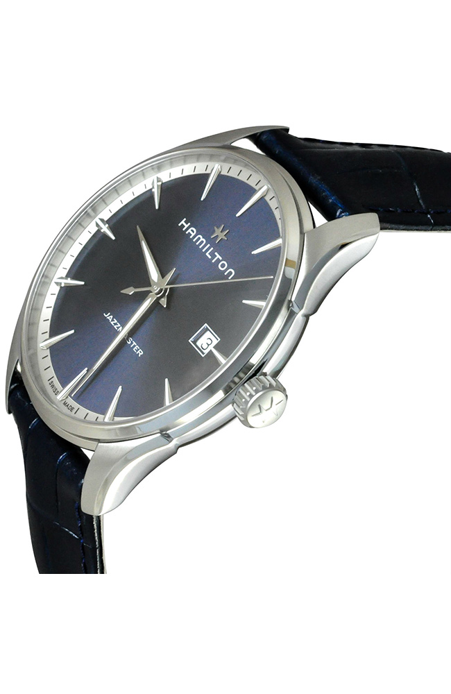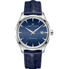 Ανδρικό ρολόι Hamilton ελβετικής κατασκευής από ανοξείδωτο ατσάλι με μπλε καντράν και μπλε δερμάτινο λουράκι.