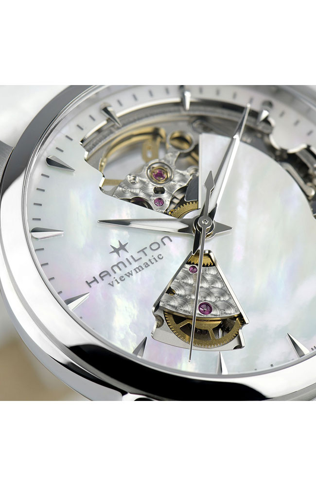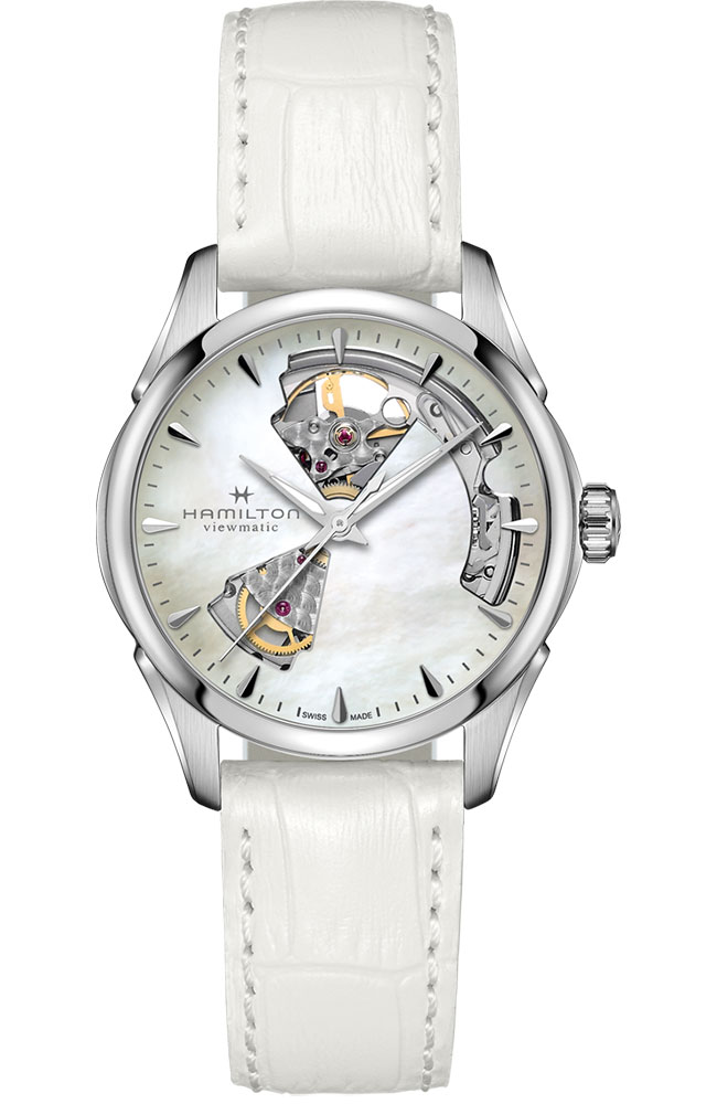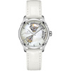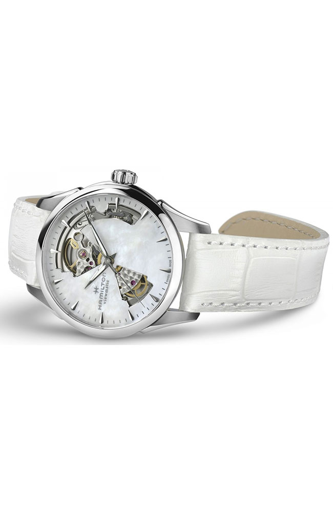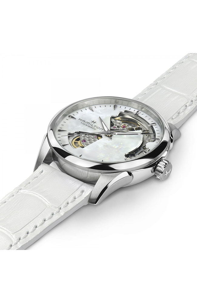 Γυνακείο ρολόι Hamilton ελβετικής κατασκευής με αυτόματο μηχανισμό, από ανοξείδωτο ατσάλι με λευκό φίλντισι καντράν και λευκό δερμάτινο λουράκι.