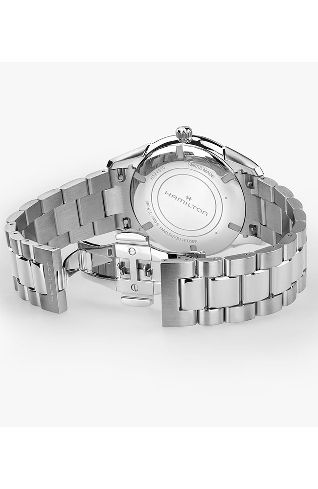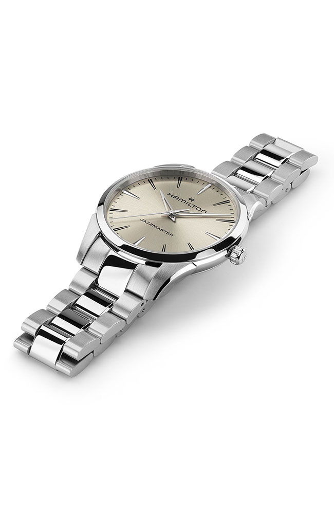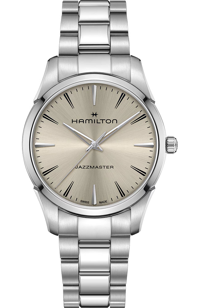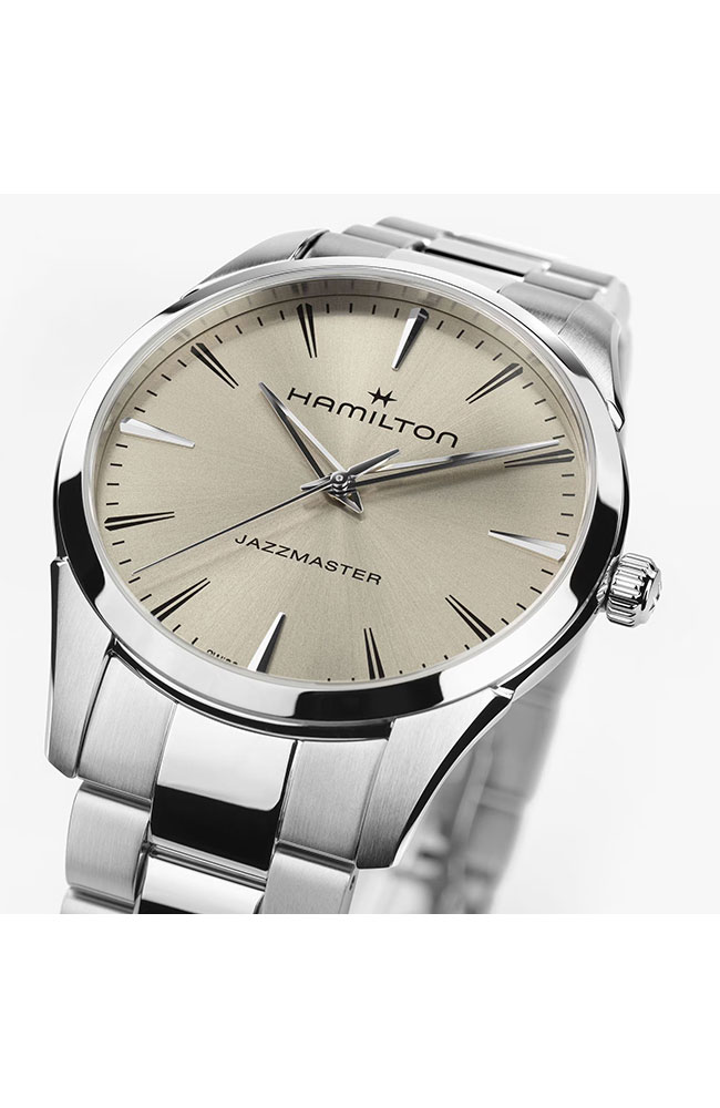 Ζεστό και ξεχωριστό, το Jazzmaster Quartz 40mm ξεχωρίζει με το μεταλλικό υπόλευκο καντράν που θυμίζει ψαμμίτη. Η εξαιρετικά λεπτή κάσα και το φινίρισμα brushed-polished δημιουργούν ένα κομψό προφίλ, που συμπληρώνεται από skeletonized δείκτες για μια σύγχρονη πινελιά. Ένα ρολόι που αποπνέει ταυτόχρονα οικειότητα και εκλεπτυσμένη κομψότητα.