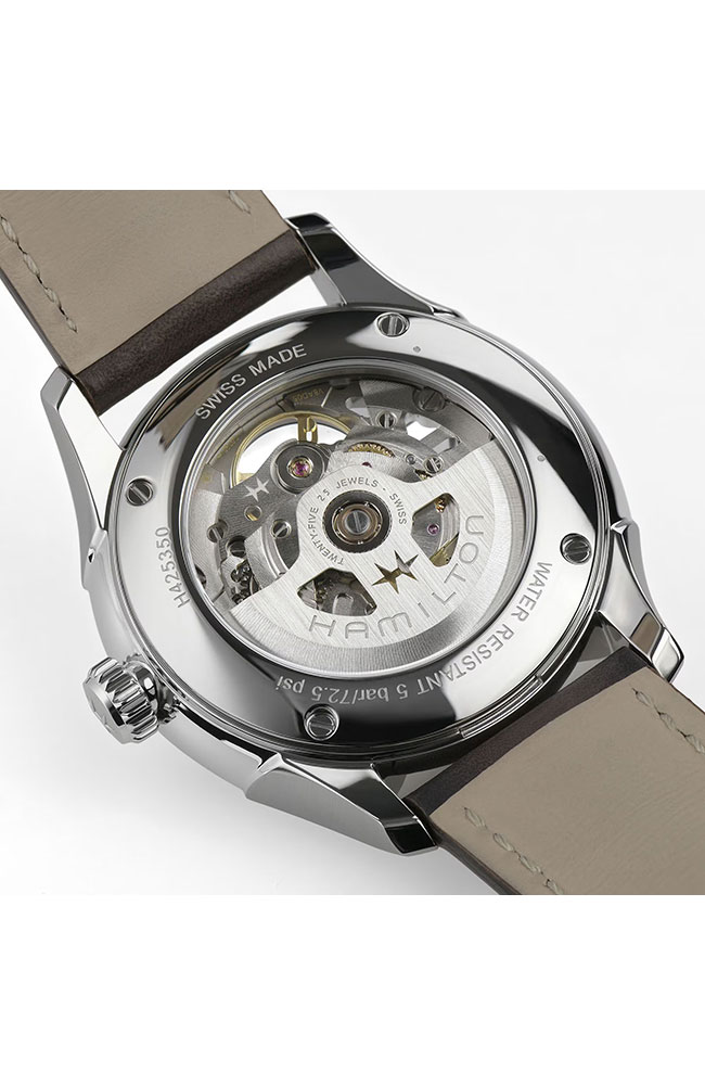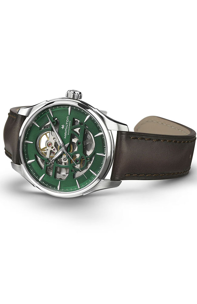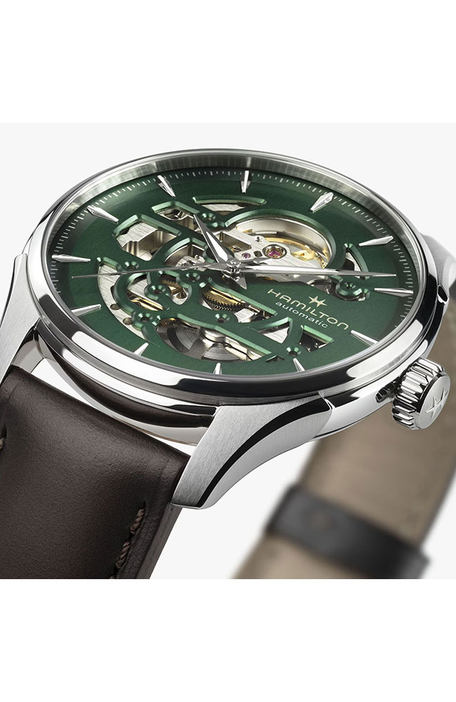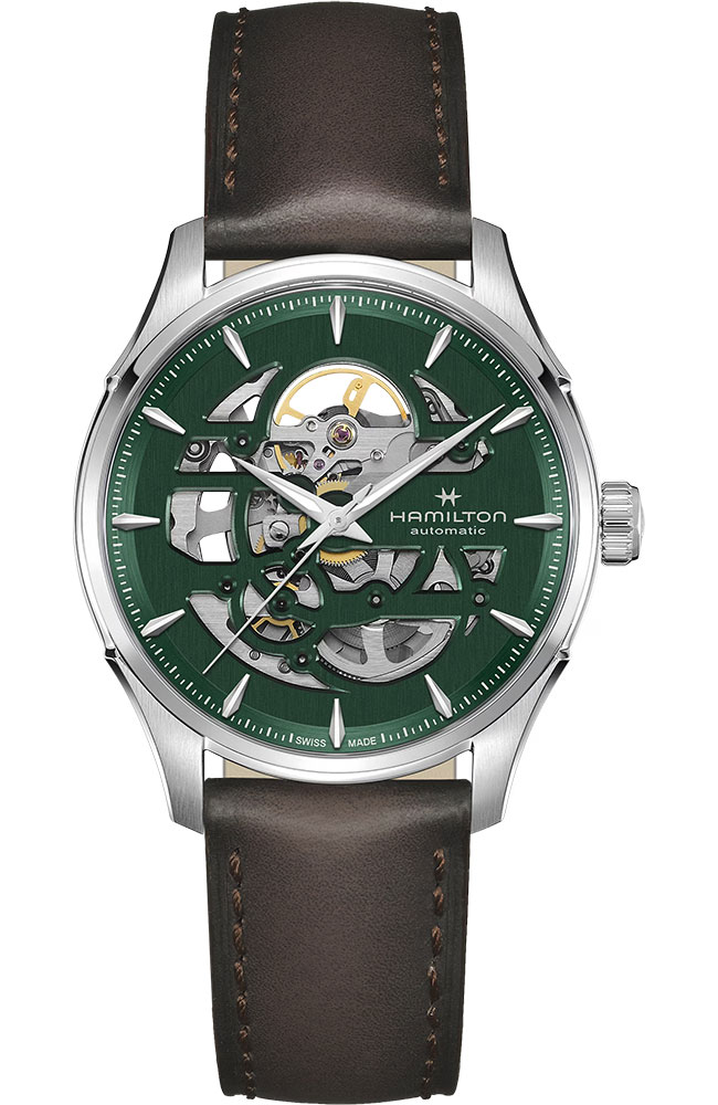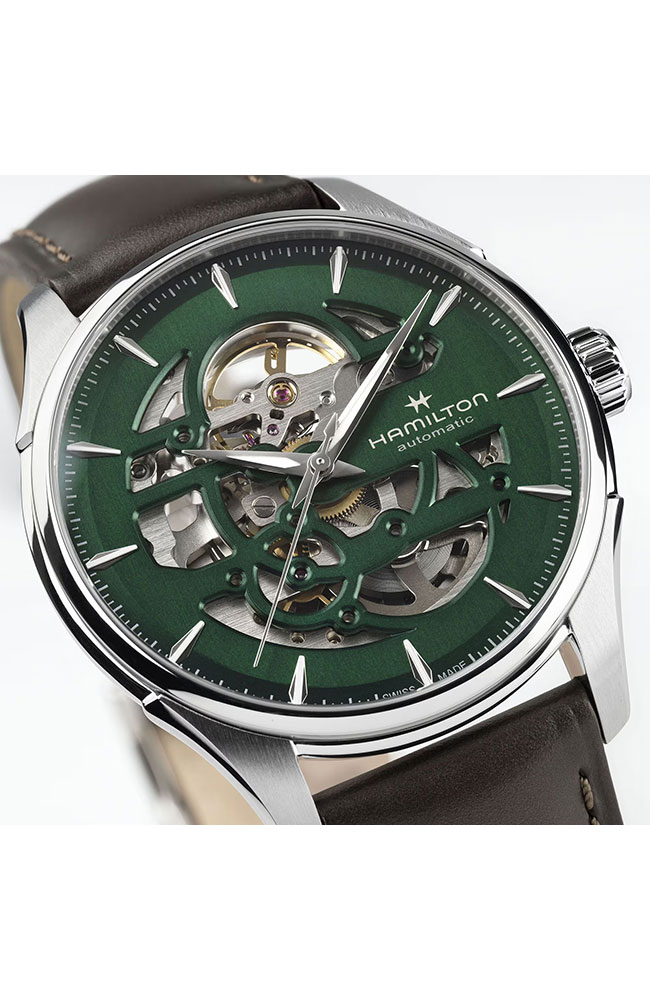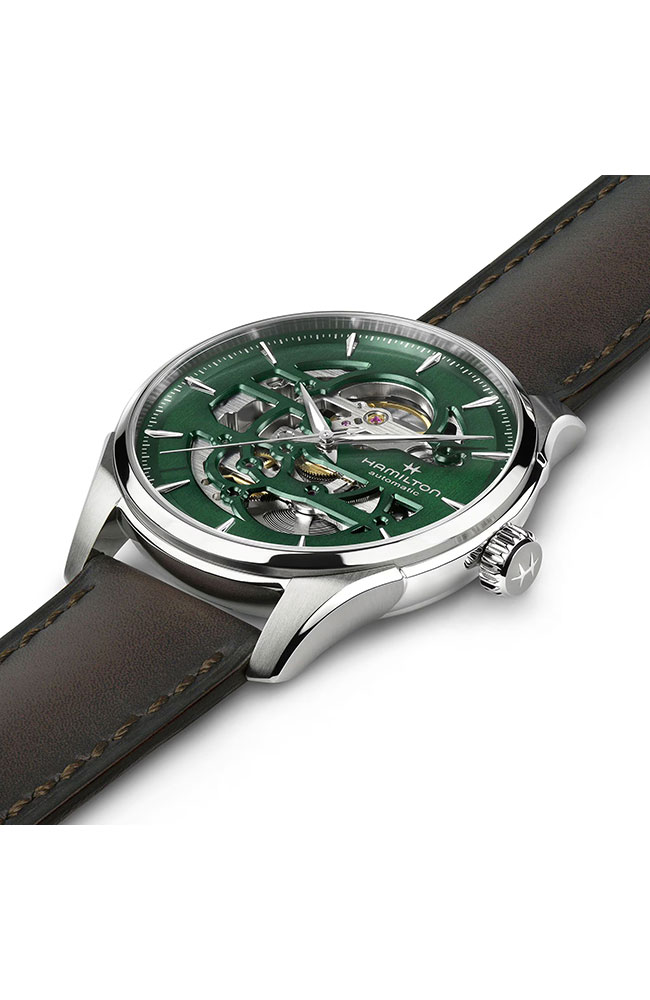 Ανδρικό ρολόι Hamilton Αυτόματο Ελβετικό, από ανοξείδωτο ατσάλι με πράσινο καντράν και καφέ δερμάτινο λουράκι.