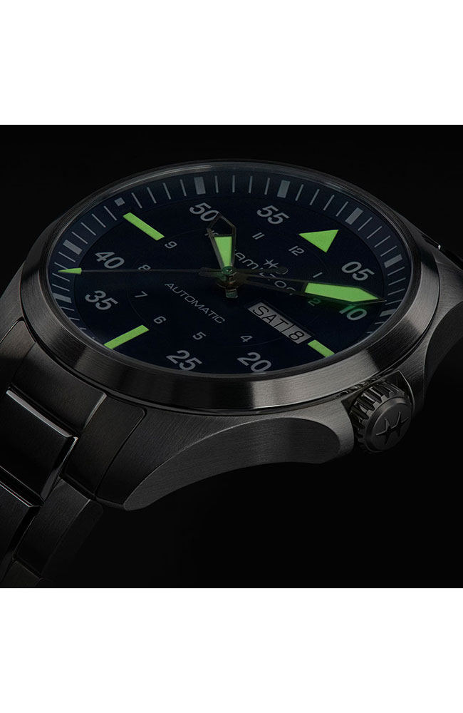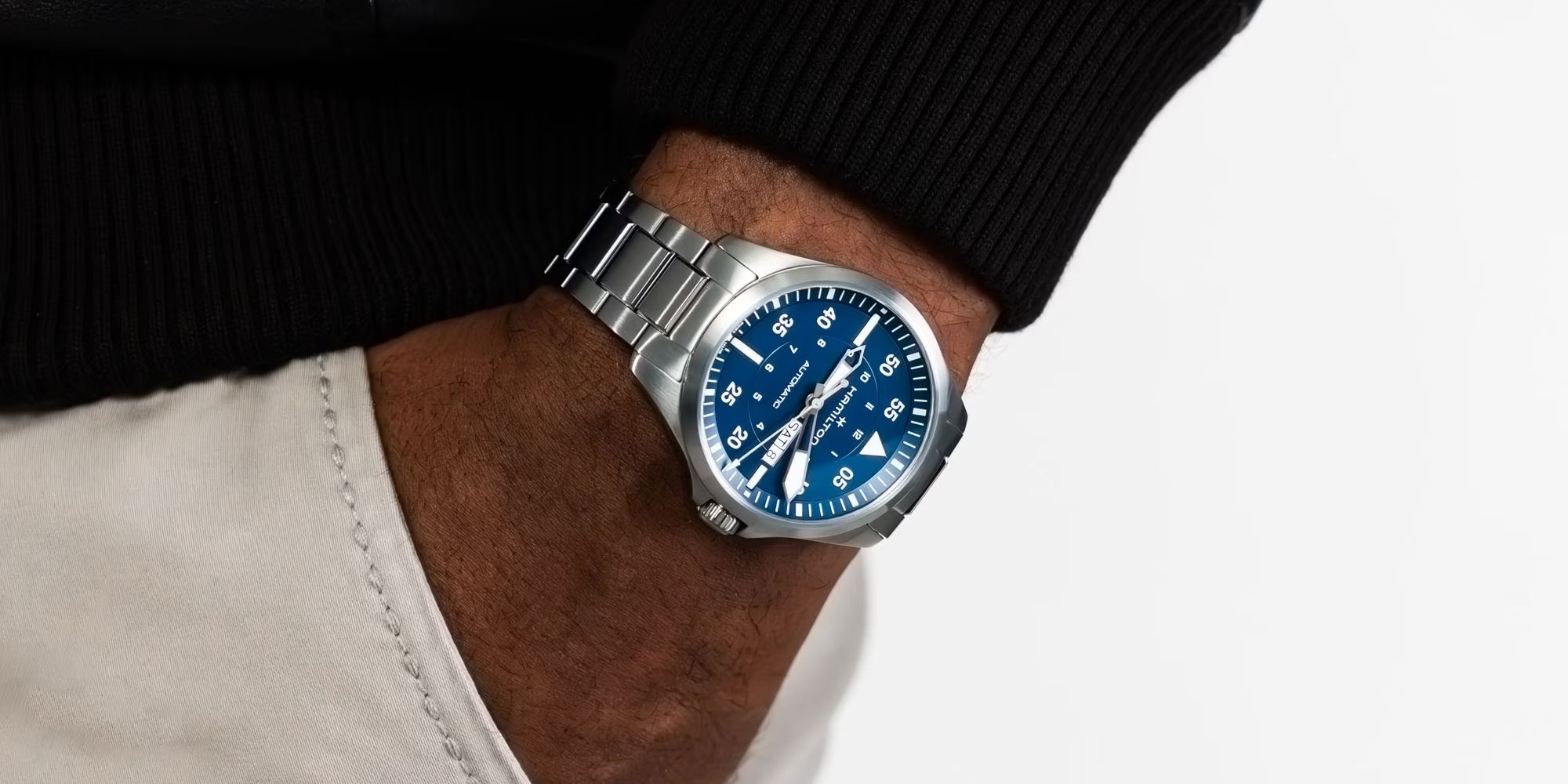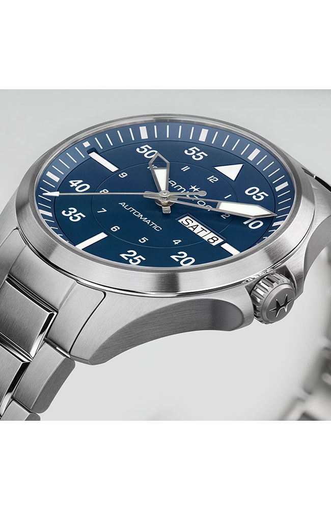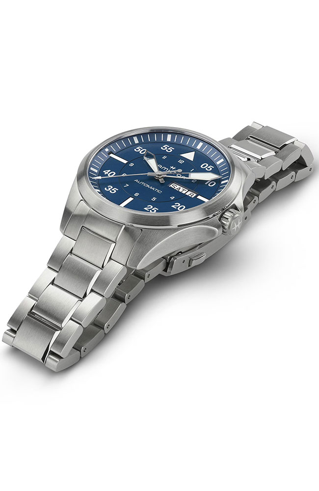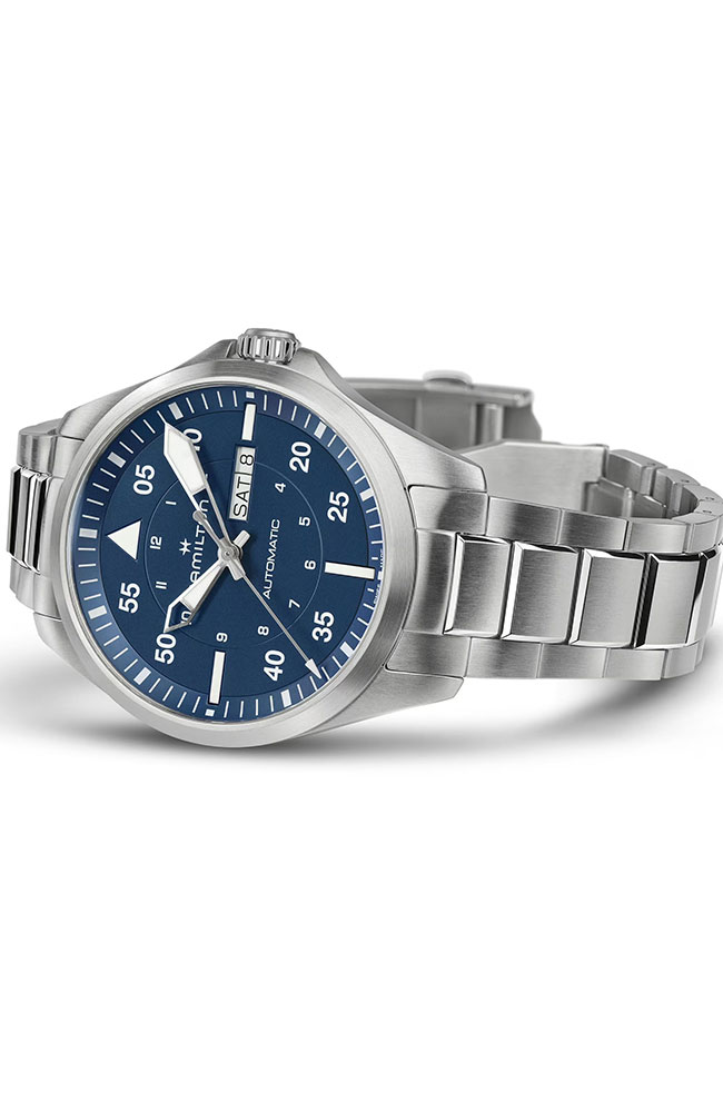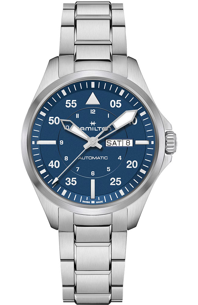 Ανδρικό ρολόι Hamilton ελβετικής κατασκευής με αυτόματο μηχανισμό, από ανοξείδωτο ατσάλι με μπλε καντράν και μπρασελέ.