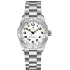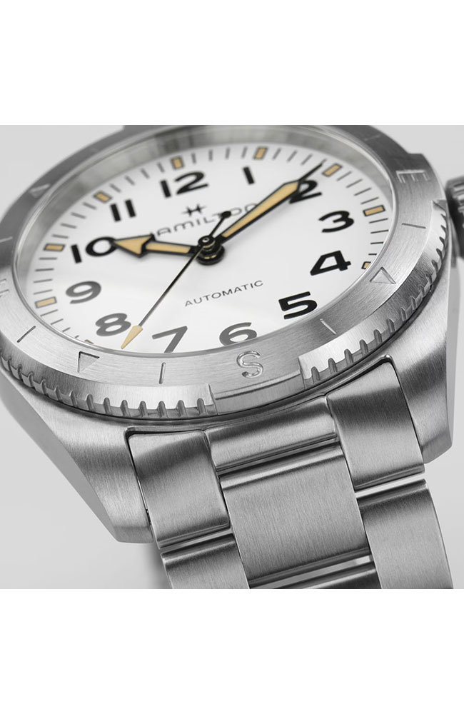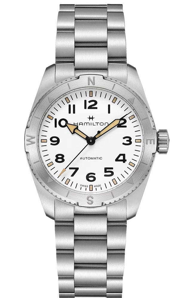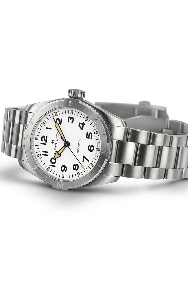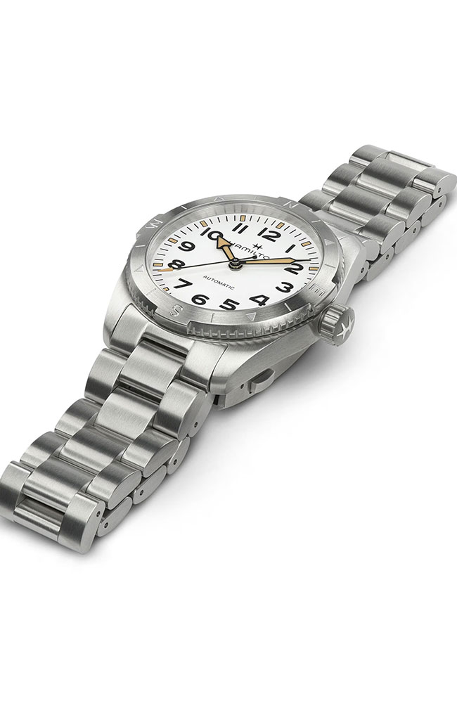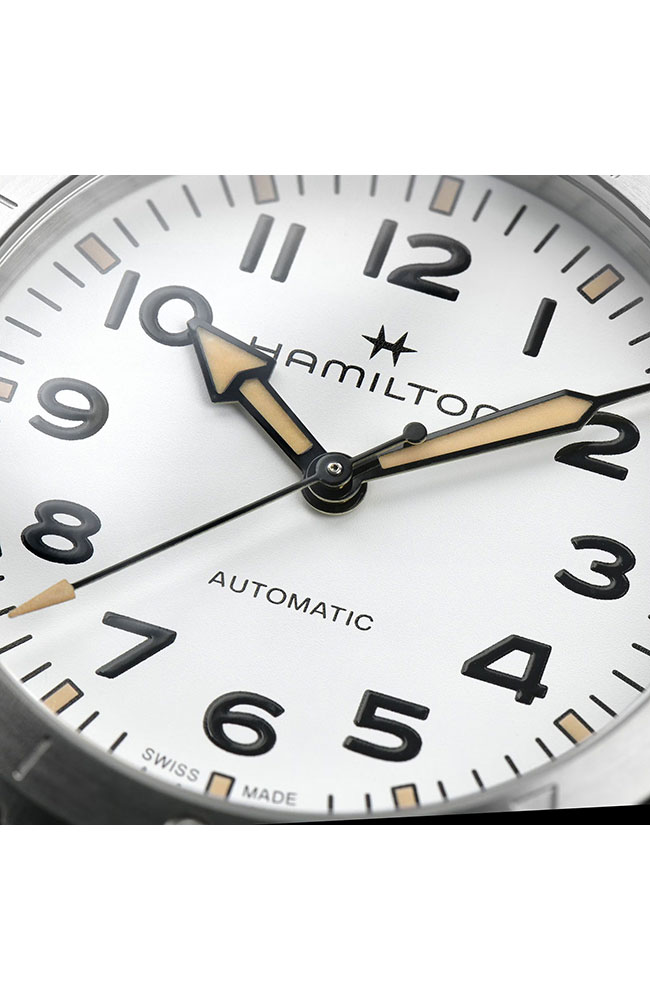 Ανδρικό ρολόι Hamilton ελβετικής κατασκευής με αυτόματο μηχανισμό, από ανοξείδωτο ατσάλι με λευκό καντράν και μπρασελέ.
