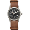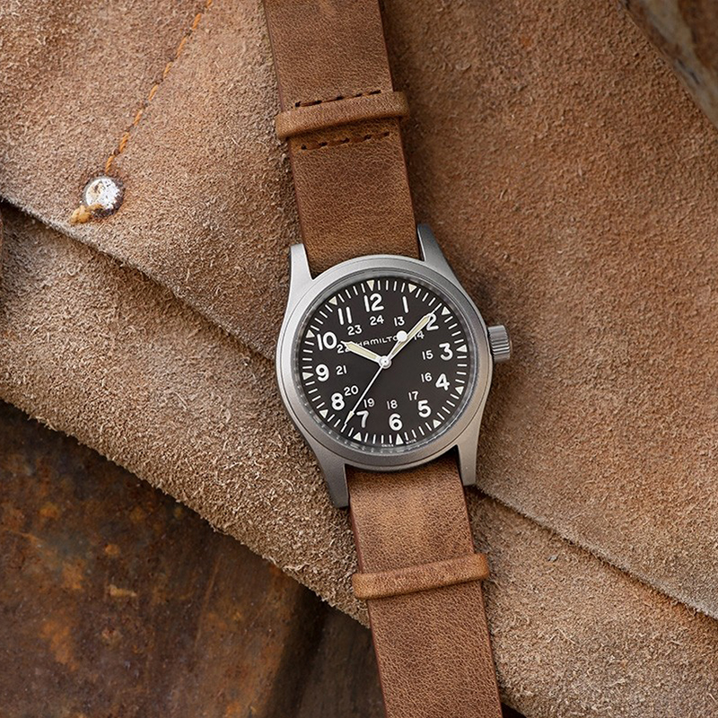 Ανδρικό ρολόι Hamilton ελβετικής κατασκευής από ανοξείδωτο ατσάλι με μαύρο καντράν και καφέ δερμάτινο λουράκι.