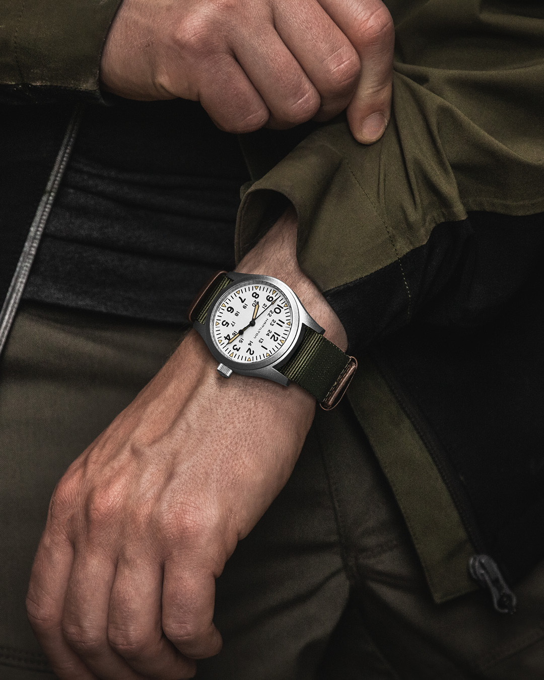Ανδρικό ρολόι Hamilton Ελβετικό, με αυτόματο μηχανισμό από ανοξείδωτο ατσάλι με λευκό καντράν και υφασμάτινο λουράκι.