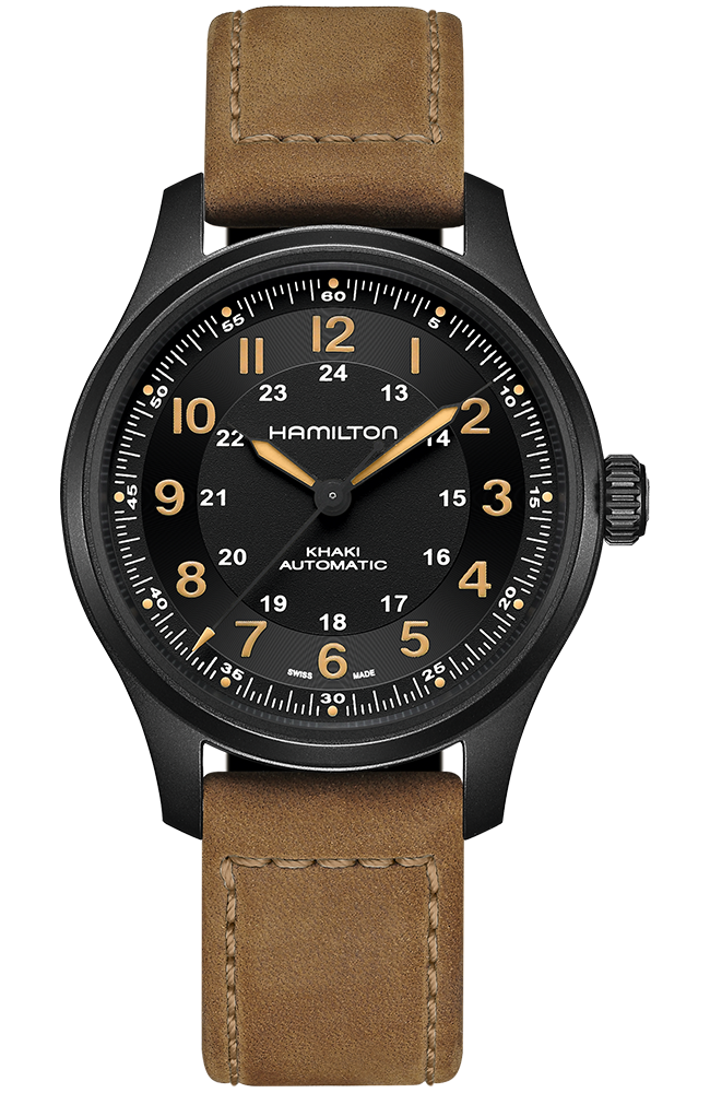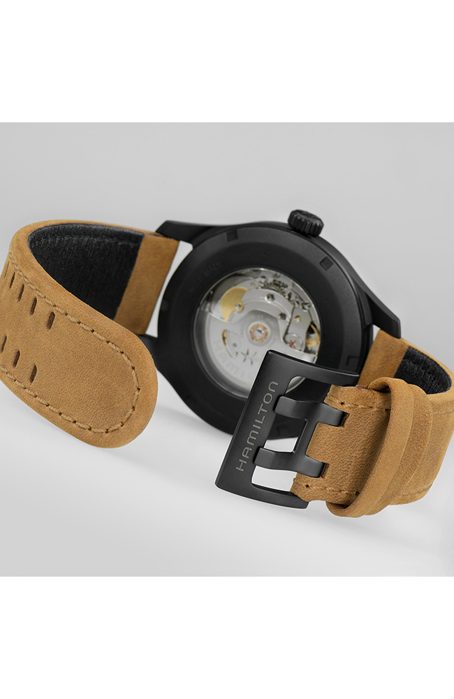 Ανδρικό ρολόι Hamilton Ελβετικό, με αυτόματο μηχανισμό από τιτάνιο με μαύρο καντράν και δερμάτινο λουράκι.