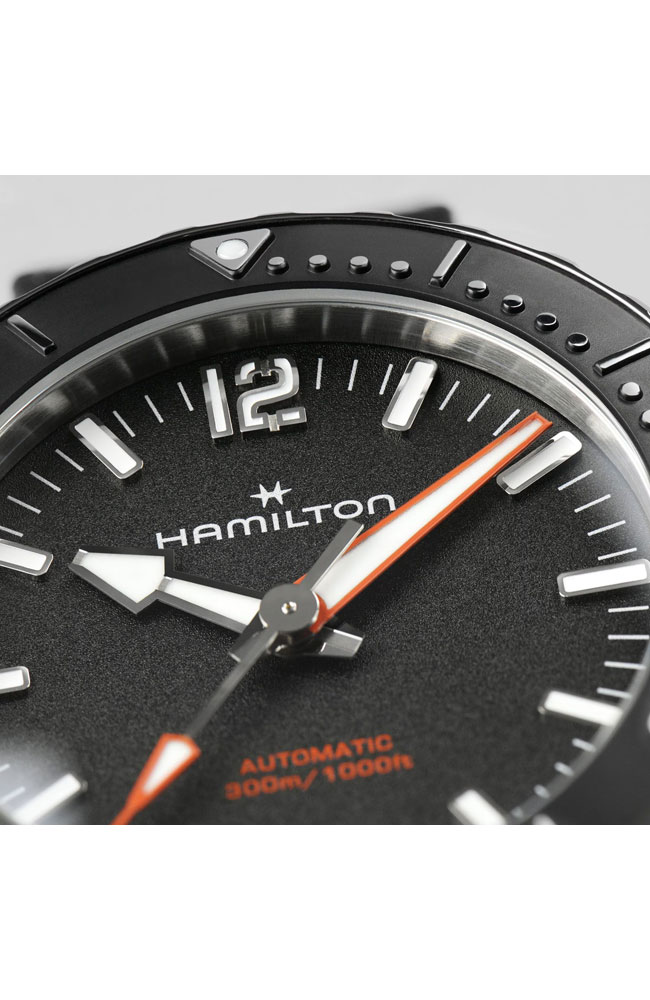 Με μια ατρόμητη νέα εμφάνιση, το Khaki Navy Frogman Automatic είναι το πιο ικανό τεχνικά ρολόι της Hamilton για ναυτιλία. Σχεδιασμένο για ακρίβεια, ευανάγνωστο και αντοχή, το όργανο ακριβείας φέρνει την ανεξιχνίαστη δύναμη του ωκεανού στον καρπό με ένα μοναδικού σχήματος προστατευτικό κορώνας και ιμάντα τακτικής από καουτσούκ με όψη κυμάτων.