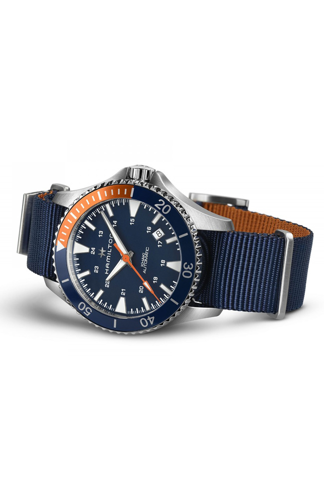 Ανδρικό ρολόι Hamilton Αυτόματος Ελβετικός μηχανισμός, από ανοξείδωτο ατσάλι με μπλε καντράν και μπλε υφάσματινο λουράκι.