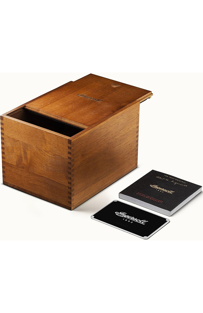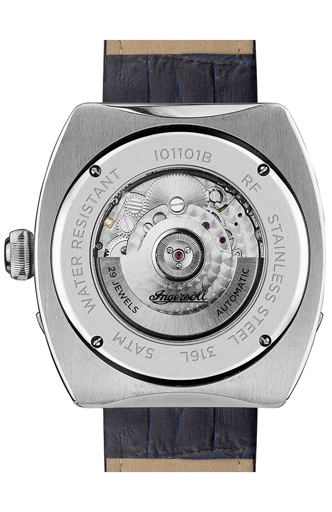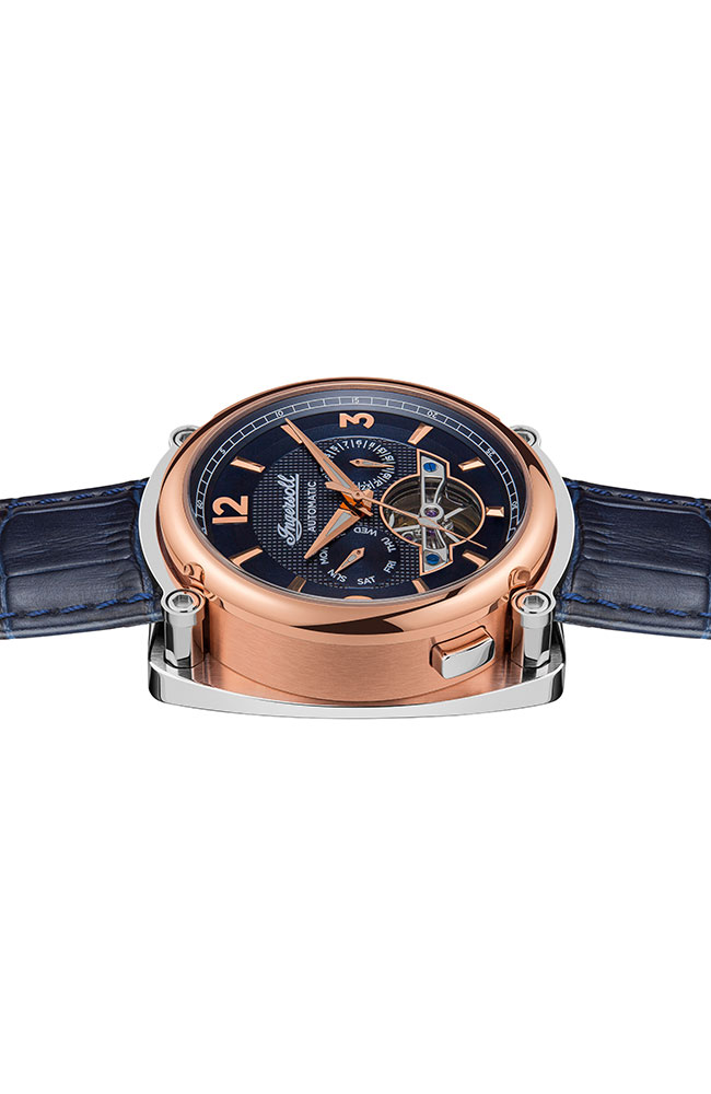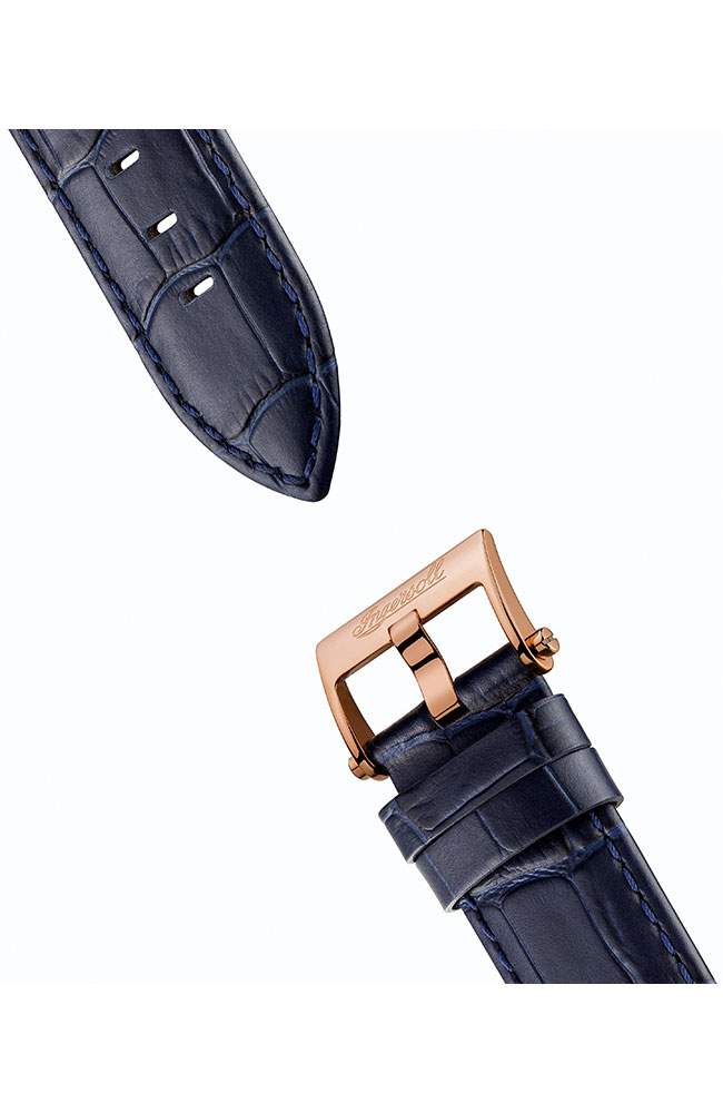 Ανδρικό ρολόι χειρός Ingersoll με αυτόματο μηχανισμό, από ανοξείδωτο ατσάλι με μπλε καντράν και δερμάτινο λουράκι.