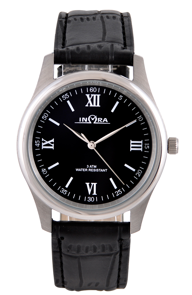 Ανδρικό ρολόι Inora από ανοξείδωτο ατσάλι με μαύρο καντράν και μαύρο δερμάτινο λουράκι.