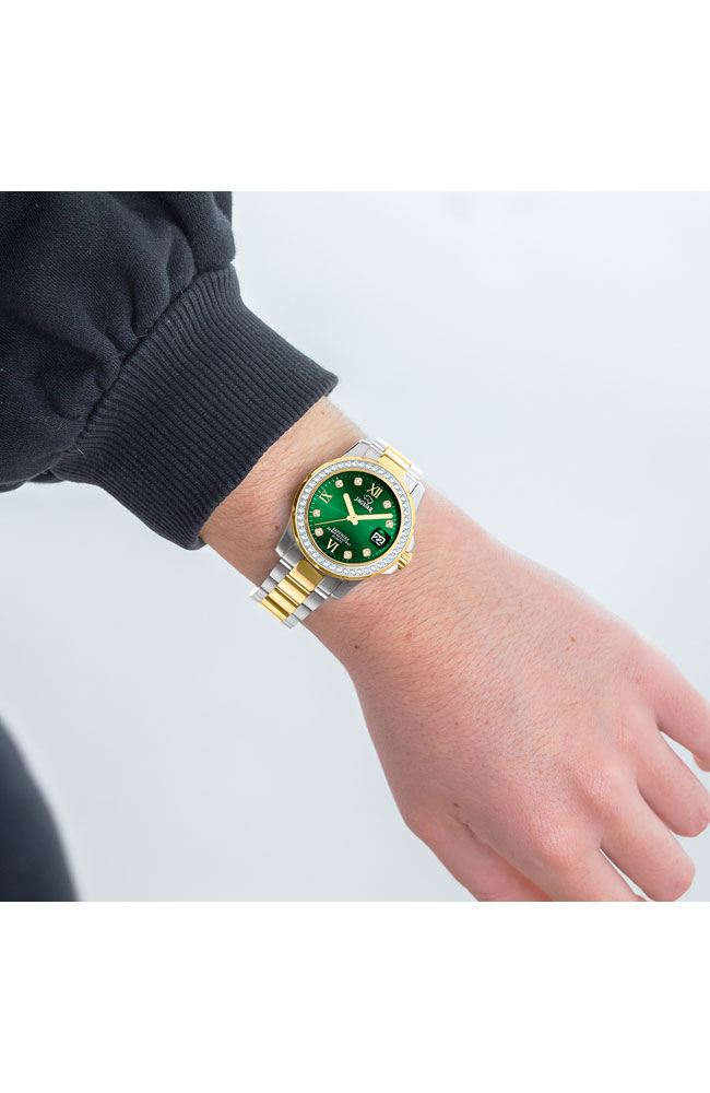 Γυναικείο ρολόι Jaguar Ελβετικής κατασκευής από ανοξείδωτο ατσάλι με πράσινο καντράν, πέτρες Ζιργκόν και δίχρωμο μπρασελέ.