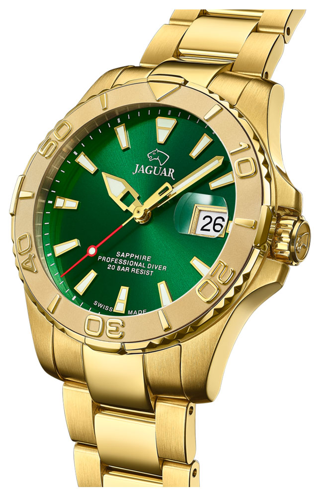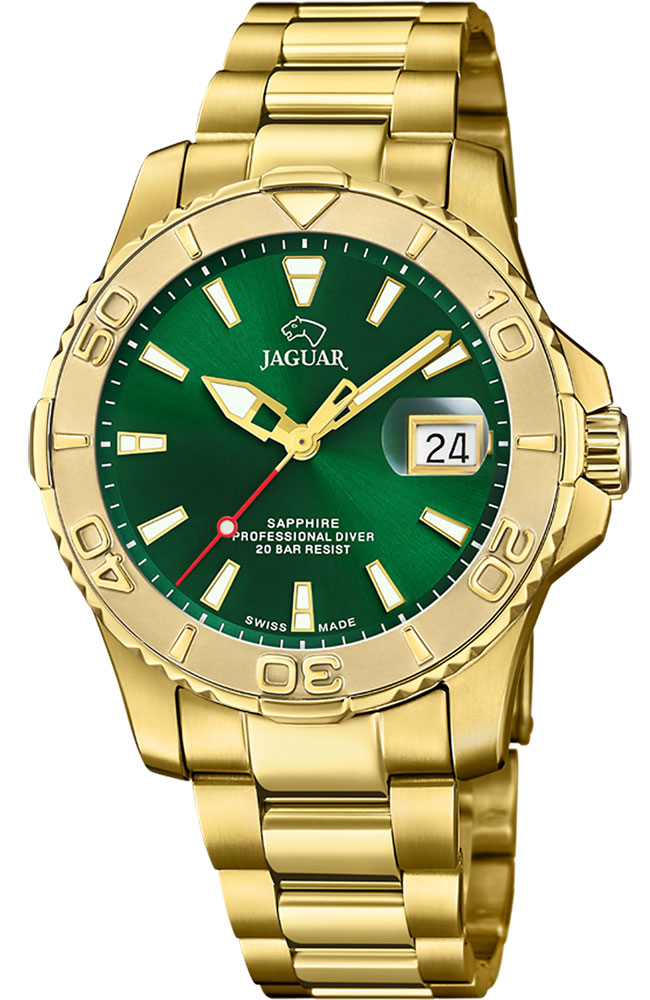 Ανδρικό ρολόι Jaguar Ελβετικής κατασκευής από επιχρυσωμένο ανοξείδωτο ατσάλι με πράσινο καντράν και χρυσό μπρασελέ.