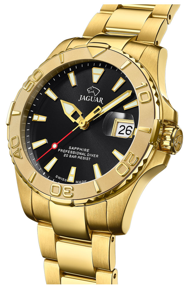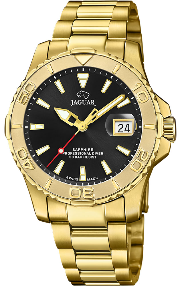 Ανδρικό ρολόι Jaguar Ελβετικής κατασκευής από επιχρυσωμένο ανοξείδωτο ατσάλι με μαύρο καντράν και χρυσό μπρασελέ.