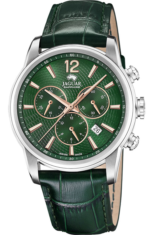 Ανδρικό ρολόι Χρονογράφος Jaguar Ελβετικής κατασκευής από ανοξείδωτο ατσάλι με πράσινο καντράν και πράσινο δερμάτινο λουράκι.
