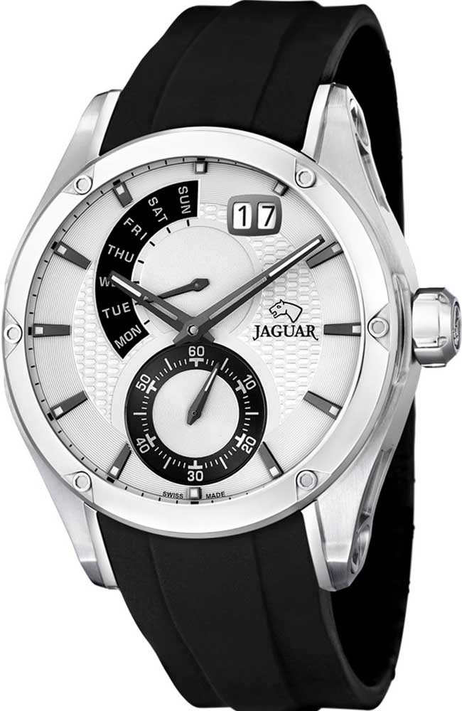 Ανδρικό ρολόι Jaguar Ελβετικής κατασκευής από ανοξείδωτο ατσάλι με λευκό καντράν και μαύρο καουτσούκ λουράκι.