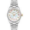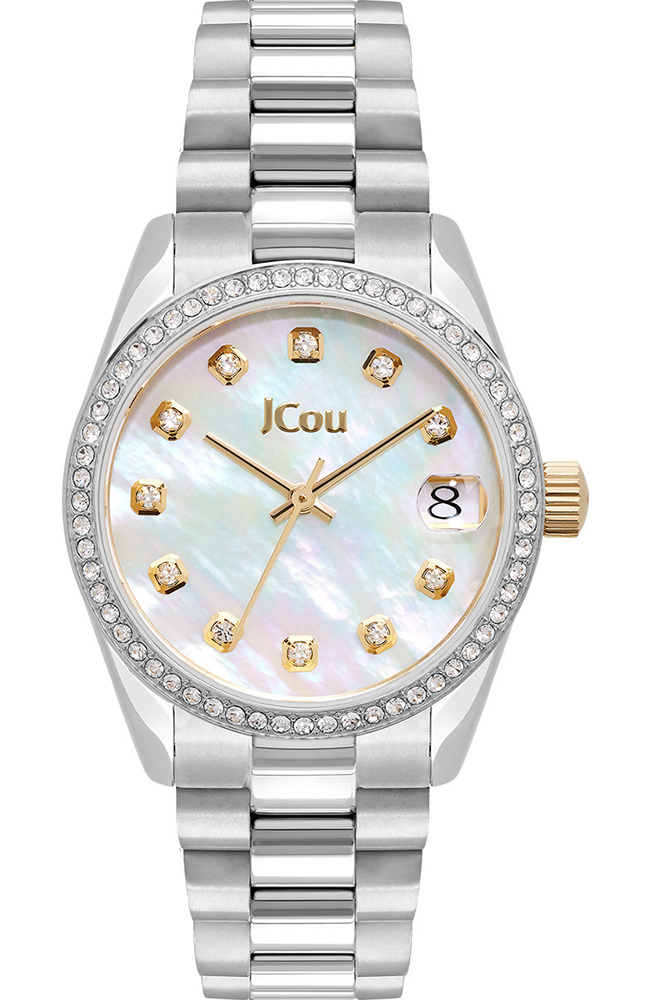 Γυναικείο ρολόι χειρός JCOU από ανοξείδωτο ατσάλι με λευκό φίλντισι καντράν, πέτρες ζιργκόν και μπρασελέ.