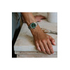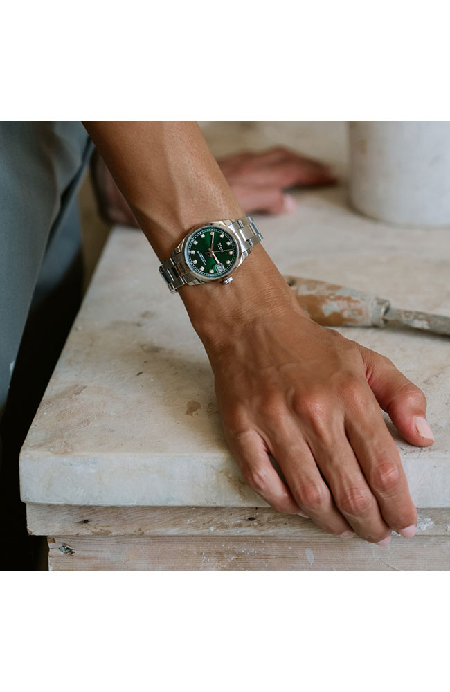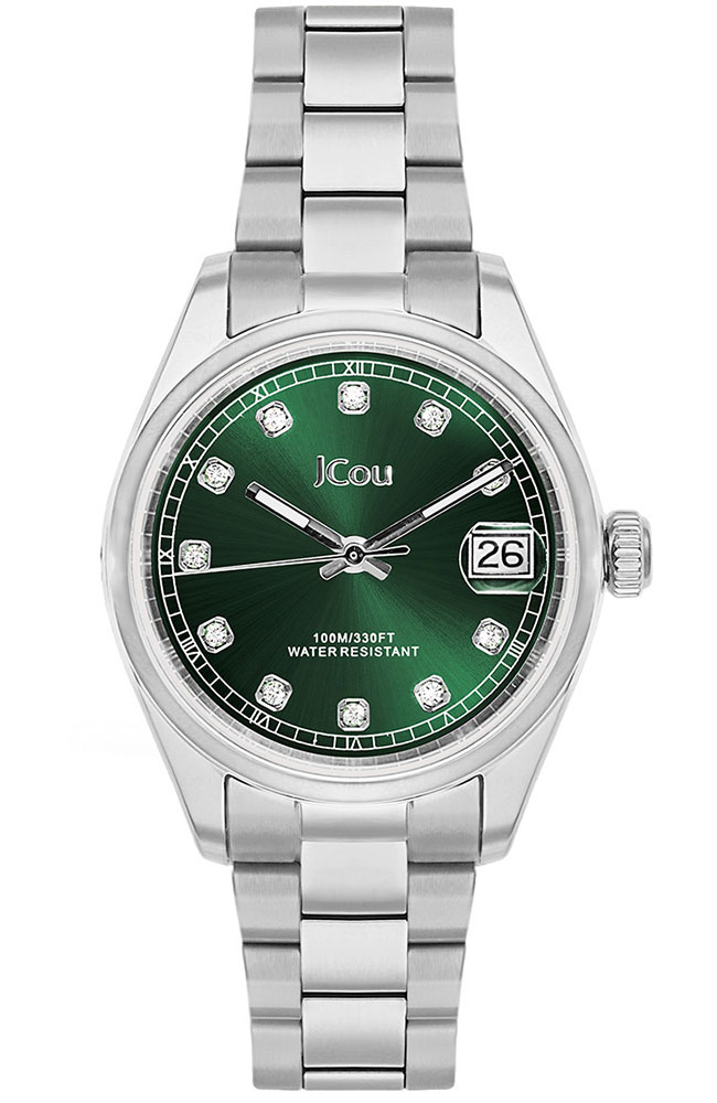 Γυναικείο ρολόι χειρός JCOU από ανοξείδωτο ατσάλι με πράσινο καντράν, πέτρες ζιργκόν και μπρασελέ.