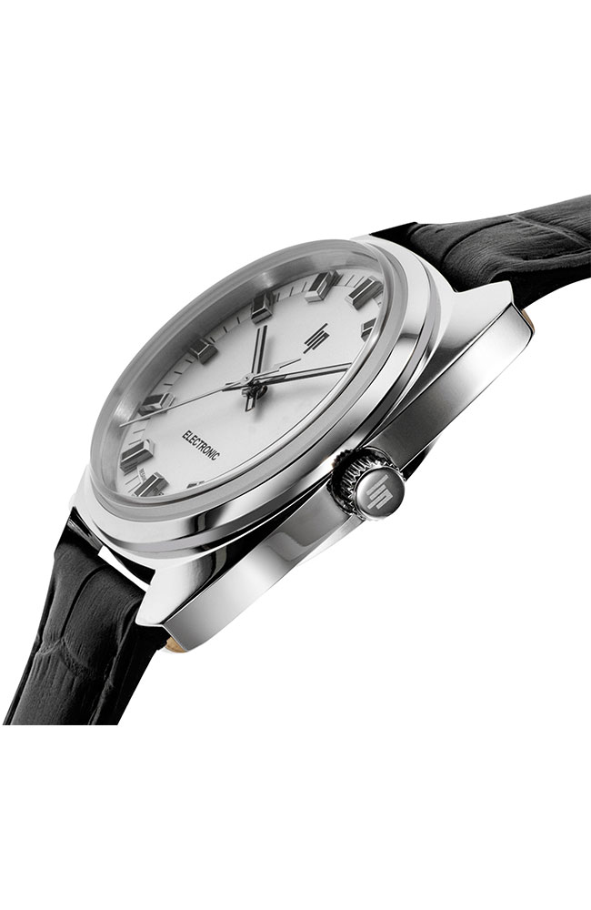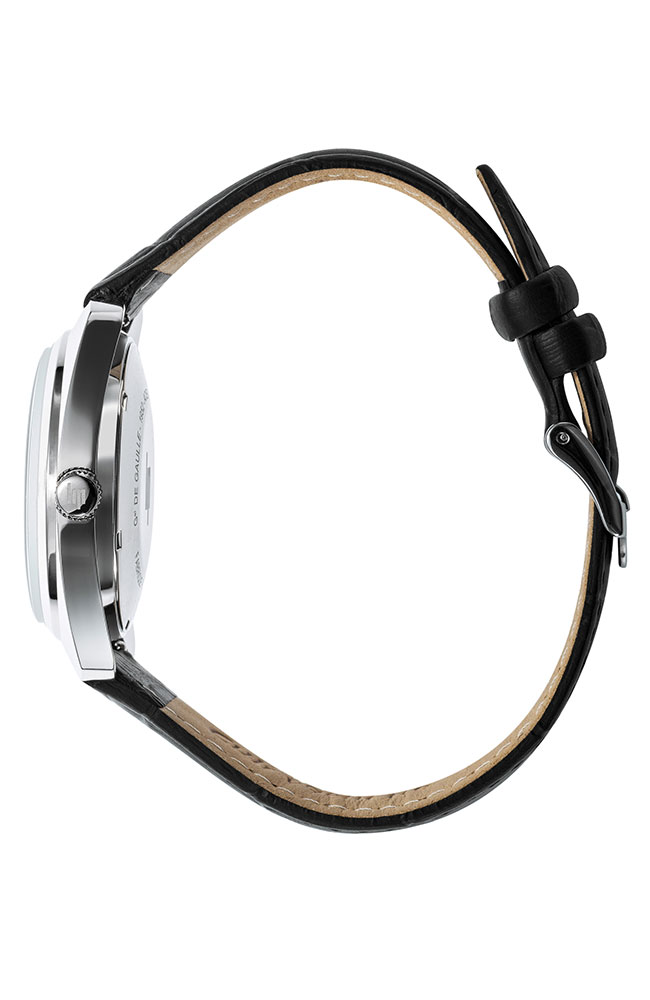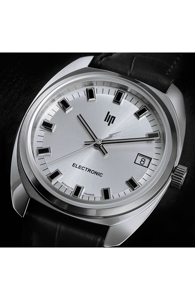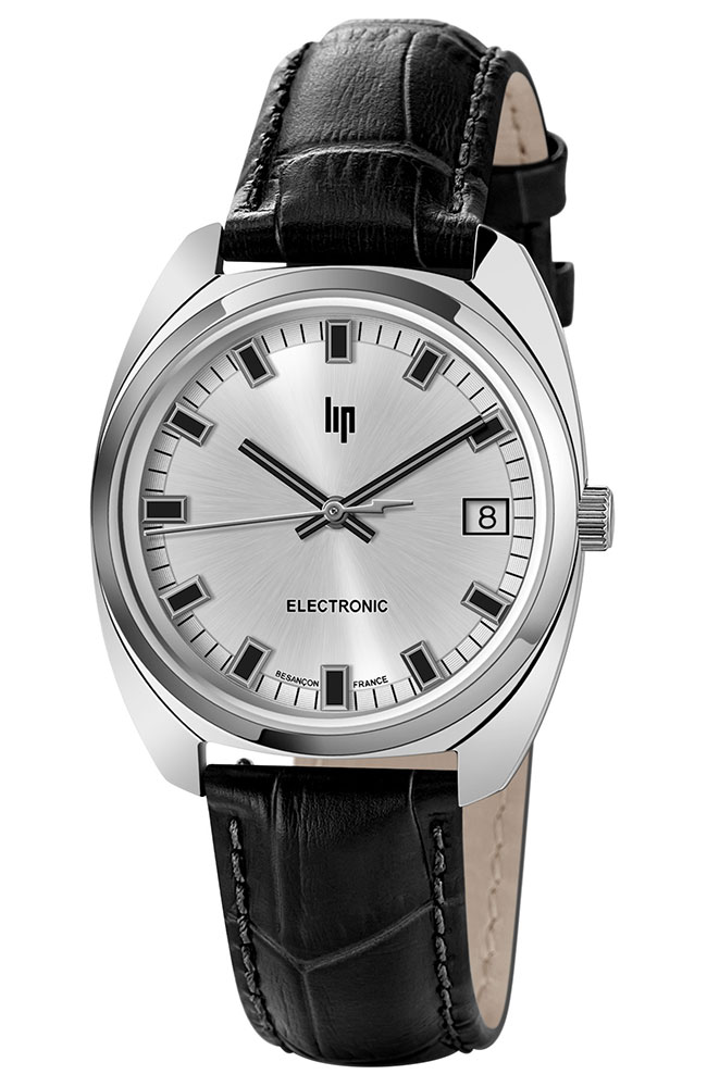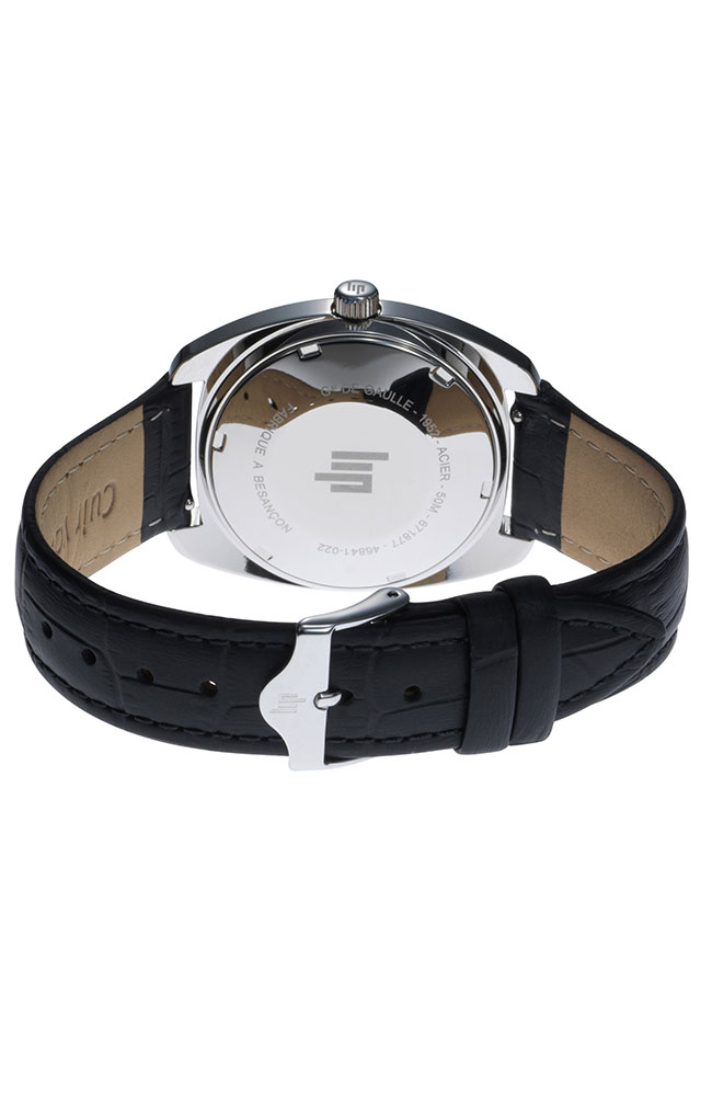 Γυναικείο ρολόι Lip από επιχρυσωμένο ανοξείδωτο ατσάλι με ασημί καντράν και μαύρο δερμάτινο λουράκι.