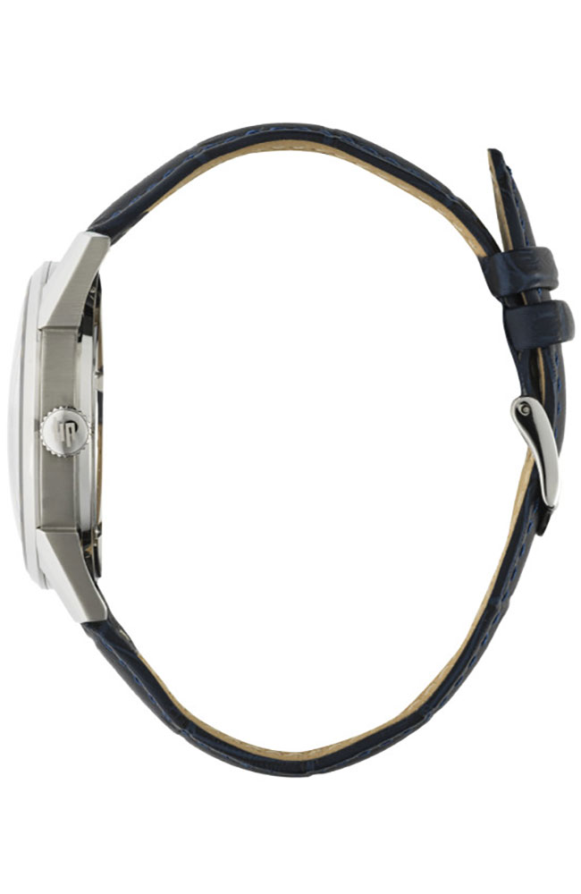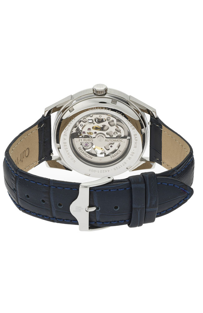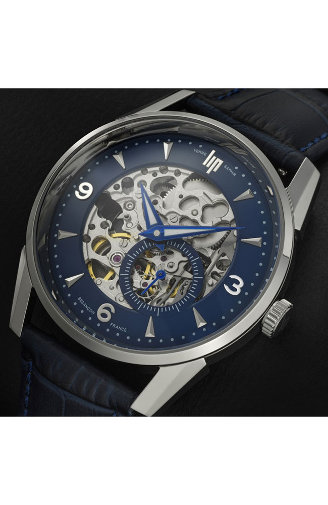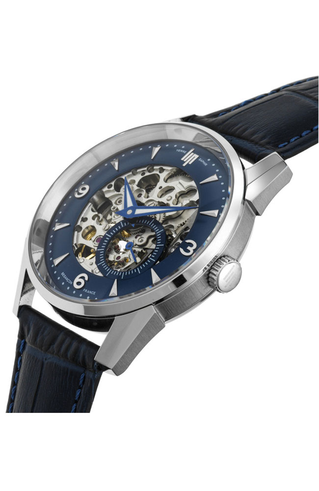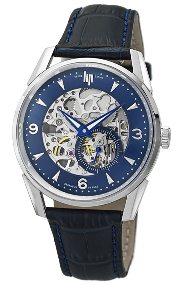 Ανδρικό ρολόι Lip με αυτόματο μηχανισμό από ανοξείδωτο ατσάλι με μπλε καντράν και δερμάτινο λουράκι.