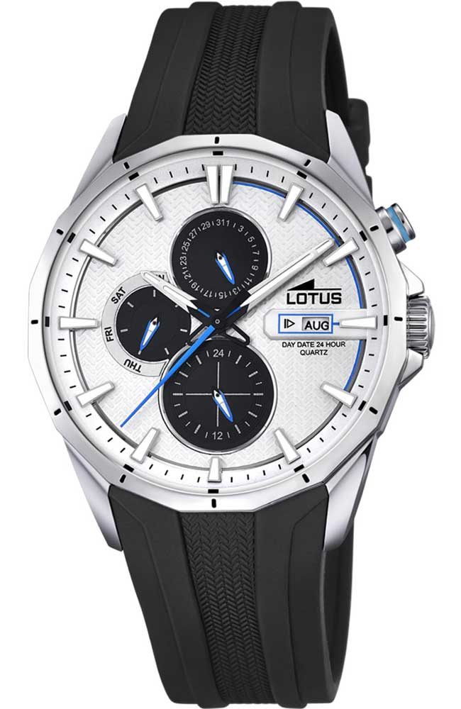 Ανδρικό ρολόι χειρός Lotus από ανοξείδωτο ατσάλι με λευκό καντράν και μαύρο καουτσούκ λουράκι.