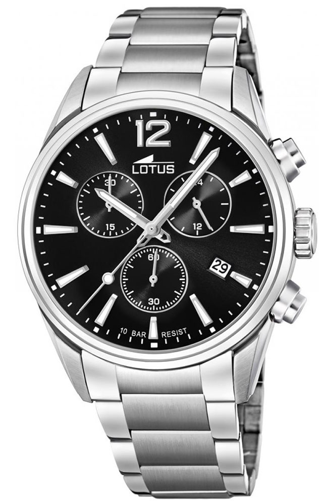 Ανδρικό ρολόι χειρός Lotus χρονογράφος από ανοξείδωτο ατσάλι με μαύρο καντράν και ασημί μπρασελέ.