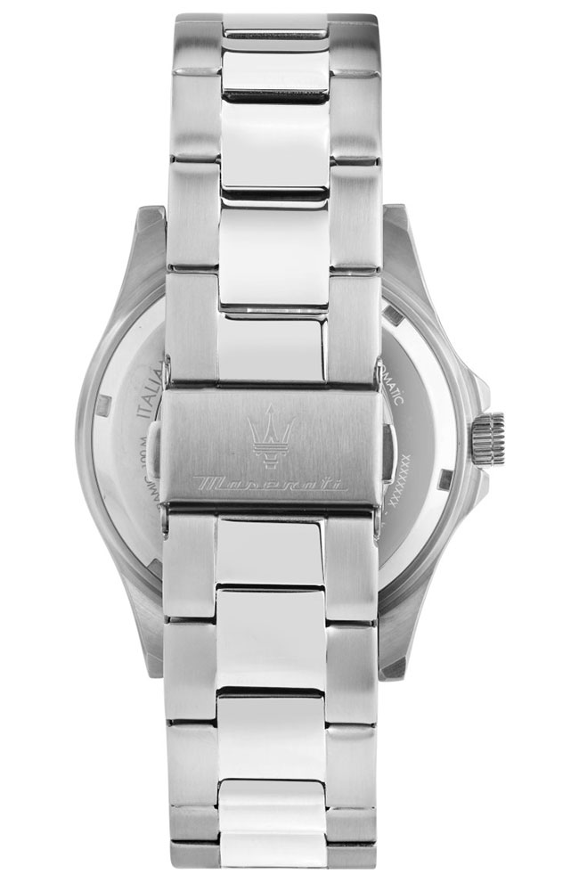 Ανδρικό ρολόι Maserati με αυτόματο μηχανισμό από ανοξείδωτο ατσάλι με μαύρο καντράν και ασημί μπρασελέ.