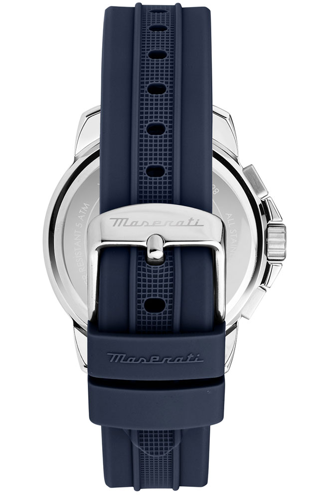 Ανδρικό ρολόι χρονογράφος Maserati από ανοξείδωτο ατσάλι με ασημί καντράν και μπλε καουτσούκ λουράκι.