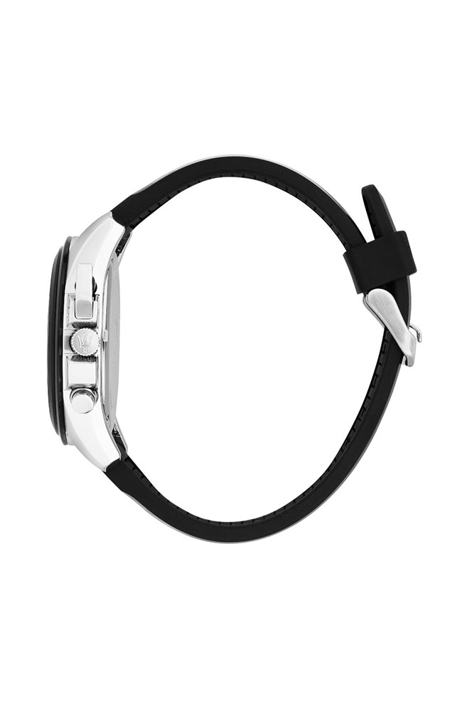 Ανδρικό ρολόι χρονογράφος Maserati από ανοξείδωτο ατσάλι με μαύρο καντράν και μαύρο καουτσούκ λουράκι.