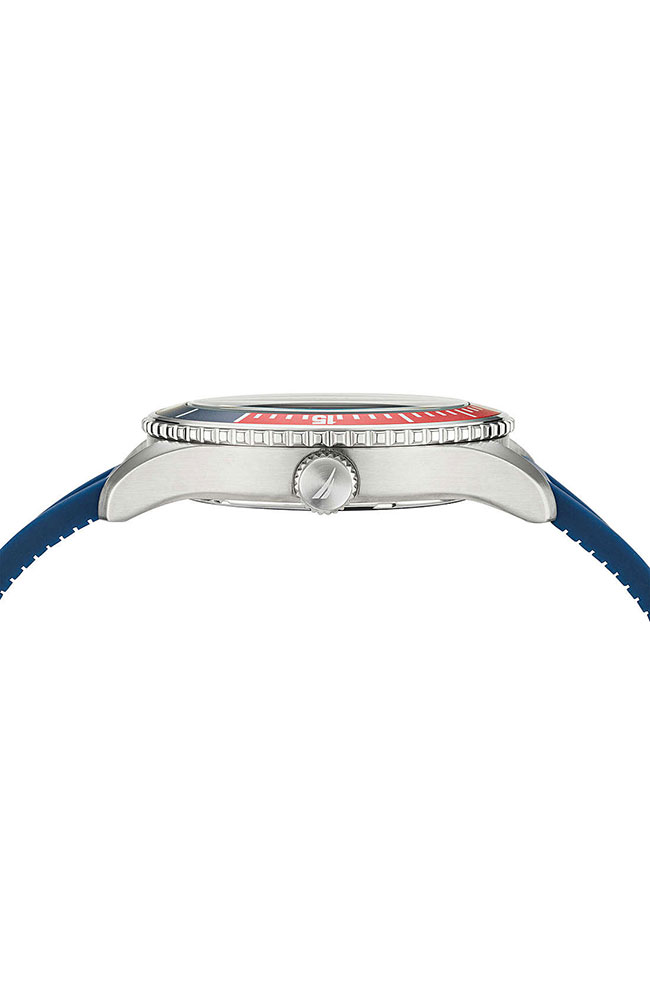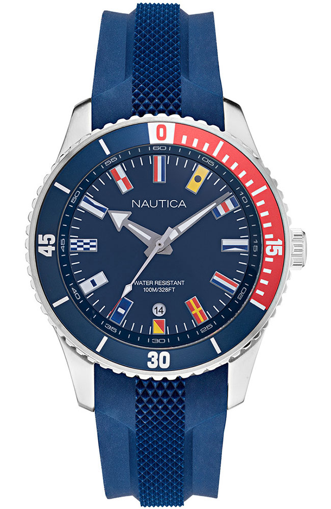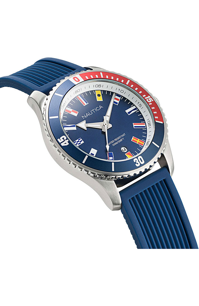 Ανδρικό ρολόι Nautica από ανοξείδωτο ατσάλι με μπλε καντράν και καουτσούκ λουράκι. Συσκευασία με ανταλλακτικό λουράκι χρώματος κόκκινο και βοηθητικό εργαλείο για την αλλαγή των λουριών.
