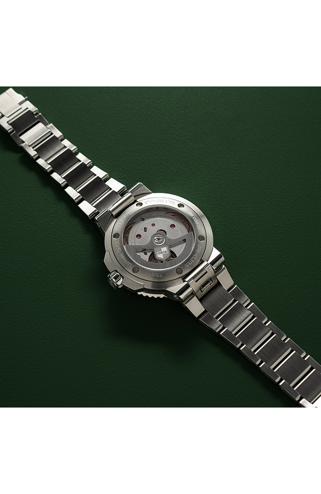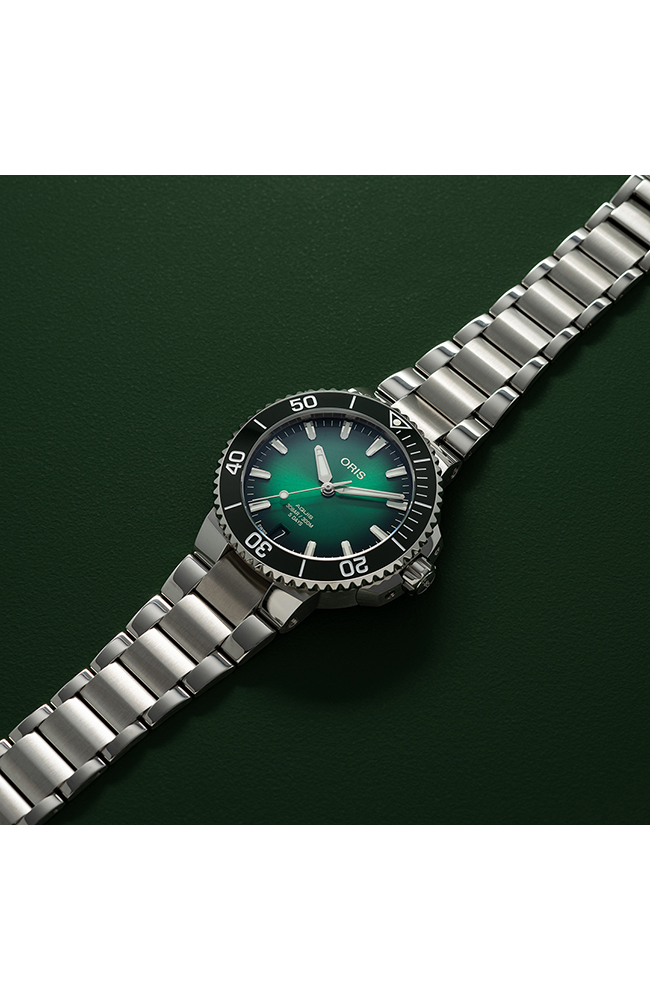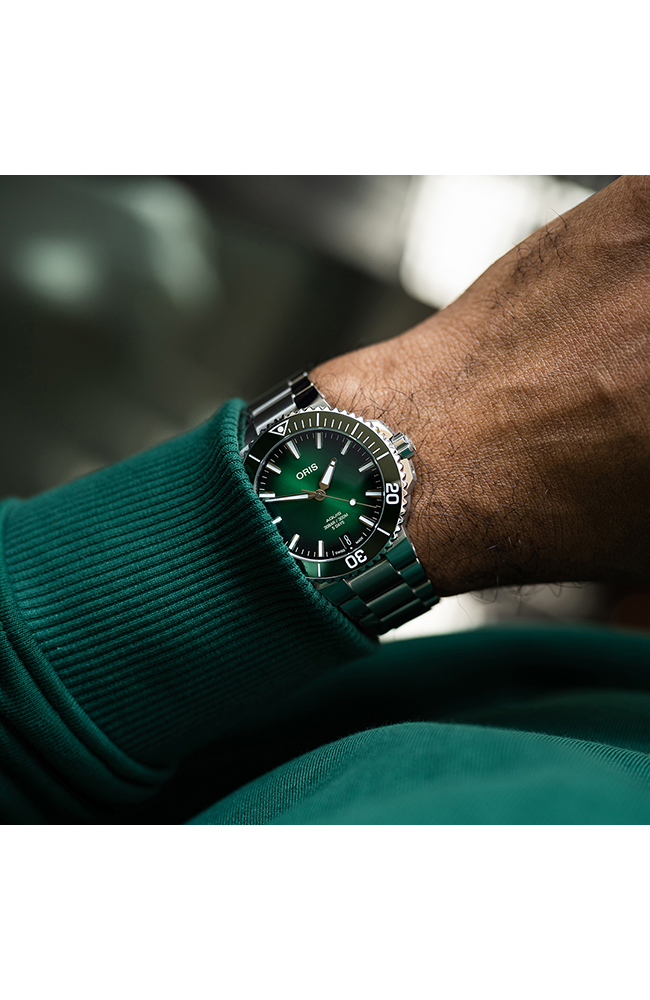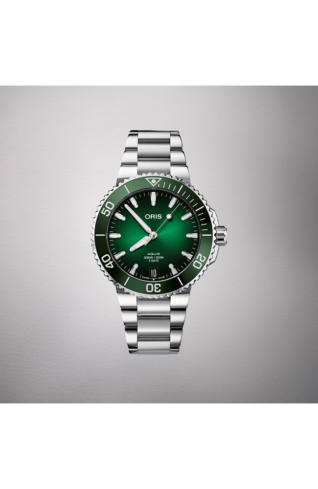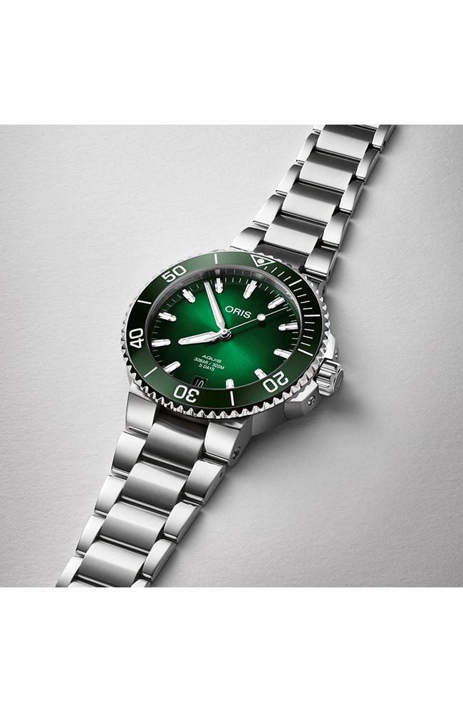 Ανδρικό ρολόι Oris με αυτόματο μηχανισμό που διαθέτει την Caliber Oris 400 η οποία προσφέρει 120 ώρες αυτονομία. Καντράν χρώματος πράσινο, με κάσα από ανοξείδωτο ατσάλι και ασημί μπρασελέ.