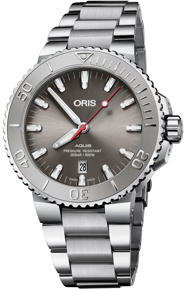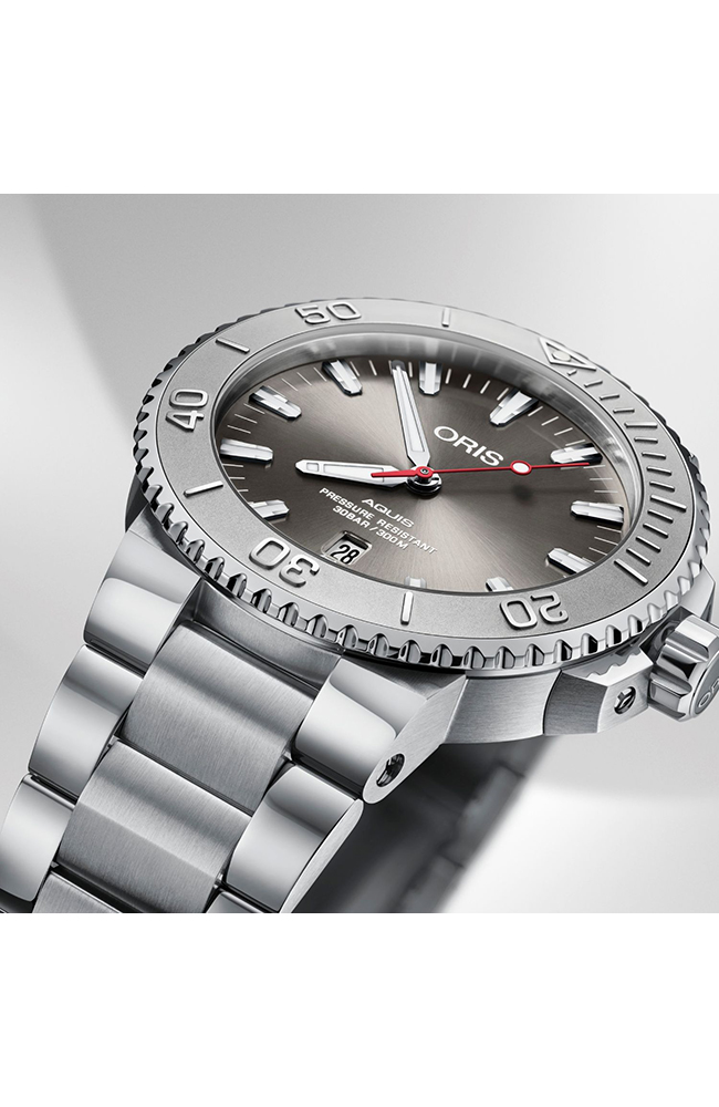 Το Oris Aquis Date Relief είναι εμπνευσμένο από το χρώμα και την αίσθηση του νερού. Το γκρι καντράν θυμίζει το χρώμα μιας φουρτουνιασμένης θάλασσας, ενώ οι χαρακτηριστικοί αριθμοί της κλίμακας κατάδυσης του ρολογιού σε ανάγλυφο είναι μια υπενθύμιση της υφής του νερού, καθώς και του βασικού ρόλου του σε όλη τη ζωή