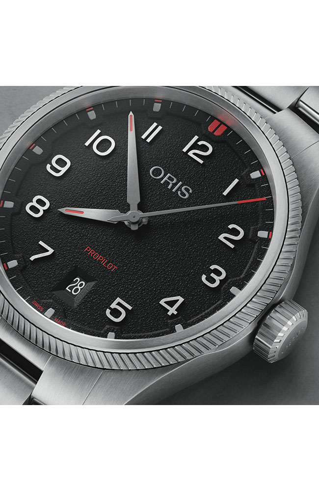 Για το Desert Edition, η κάσα των 41mm έχει κατασκευαστεί από ελαφρύ ανθρακόνημα, χρησιμοποιώντας μια καινοτόμο διαδικασία πρόσθετης κατασκευής και χύτευσης, που εισήγαγαν οι μηχανικοί της Oris στην σύγχρονη ωρολογοποιία. Το ρολόι συνοδεύεται από υβριδικό λουράκι από μαύρο καουτσούκ και ύφασμα, με την νέα εκδοχή της διάσημης 'LIFT' αγκράφας του ProPilot Date, η οποία έχει επανασχεδιαστεί για να προσφέρει μεγαλύτερη άνεση και ακρίβεια στην ρύθμιση. Συνδυαστικά, αυτά τα στοιχεία εξασφαλίζουν κορυφαία εργονομία και άνεση, ακόμη και σε θερμές, ξηρές συνθήκες. Η κορώνα, η υπερμεγέθης στεφάνη και το πίσω μέρος της κάσας είναι από ανοξείδωτο ατσάλι με γκρι PVD επίστρωση η οποία ταιριάζει απόλυτα με το χρώμα της κάσας από ανθρακόνημα. Το ρολόι διαθέτει επίσης ένα καντράν σε απόχρωση μπεζ της άμμου, εμπνευσμένο από το χρώμα και την υφή της ερήμου, ενώ οι μαύροι δείκτες και αριθμοί υψηλής αντίθεσης εξασφαλίζουν άριστη αναγνωσιμότητα. Οι έντονες κόκκινες λεπτομέρειες υπογραμμίζουν τον περιπετειώση χαρακτήρα του ρολογιού. Κάθε στοιχείο του ProPilot Desert Edition έχει επιλεγεί προσεκτικά ωστέ να προσφέρει βελτιωμένη άνεση και απόδοση.