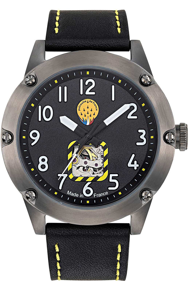 Ανδρικό ρολόι χειρός PARTOUILLE DE FRANCE με αυτόματο μηχανισμό από ανοξείδωτο ατσάλι με μαύρο καντράν και δερμάτινο λουράκι.
