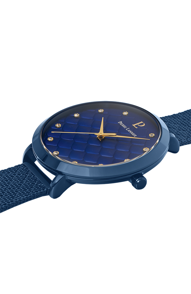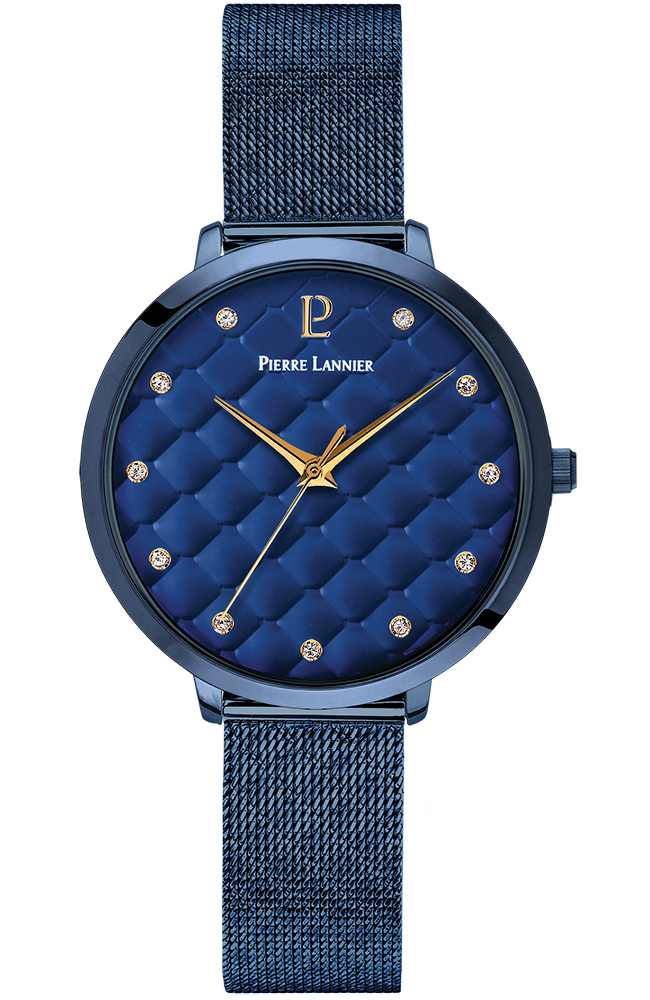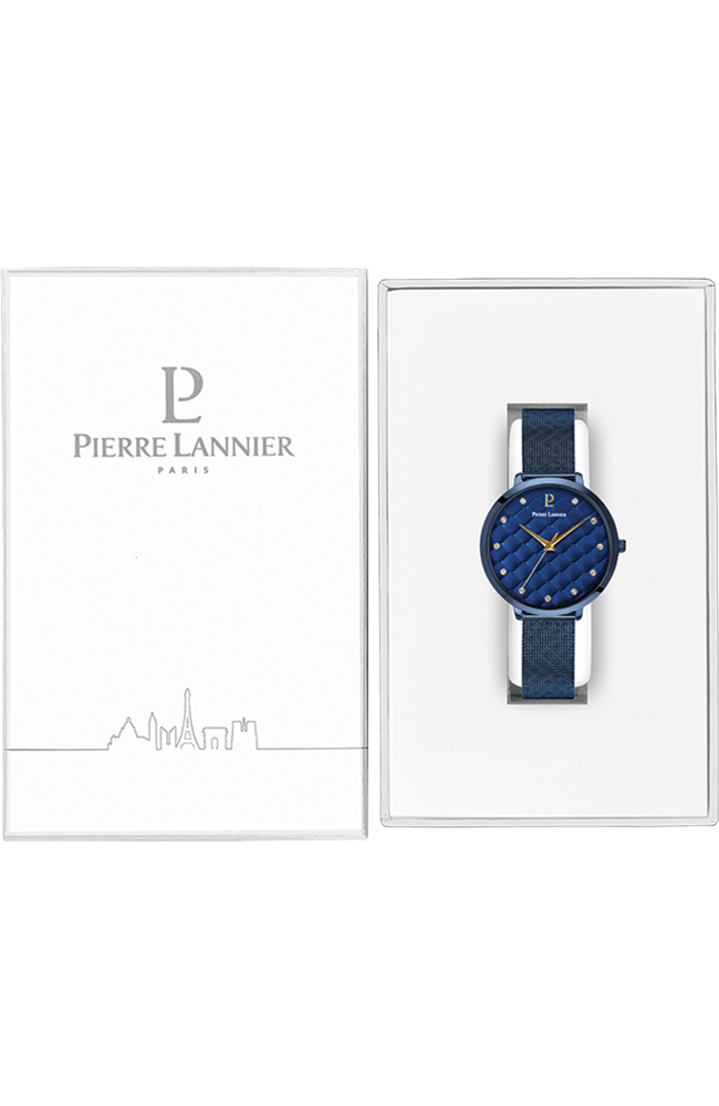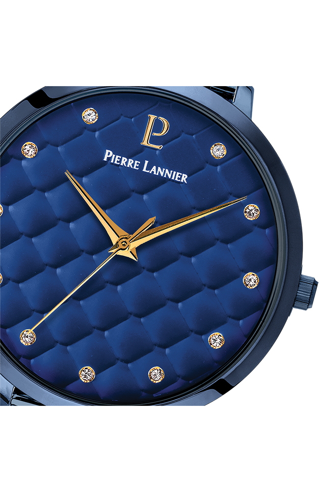 Γυναικείο ρολόι Pierre Lannier από ανοξείδωτο ατσάλι με μπλε καντράν, πέτρες ζιργκόν και μπρασελέ.