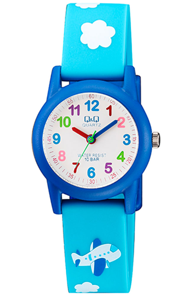 Παιδικό ρολόι χειρός Q&Q με λευκό καντράν και μπλε καουτσούκ λουράκι.