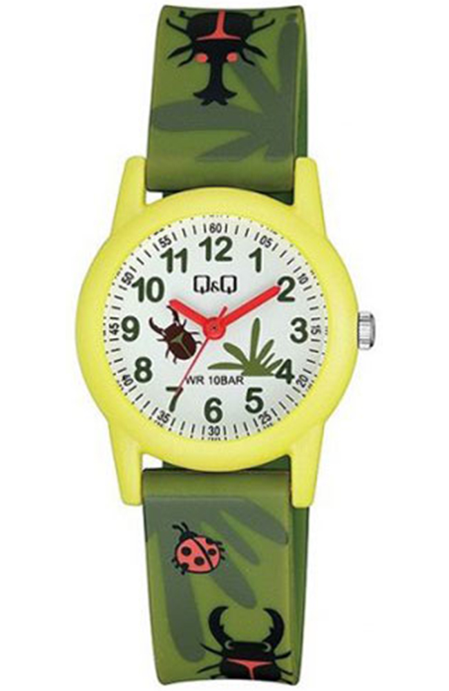 Παιδικό ρολόι χειρός Q&Q με λευκό καντράν και πράσινο καουτσούκ λουράκι.