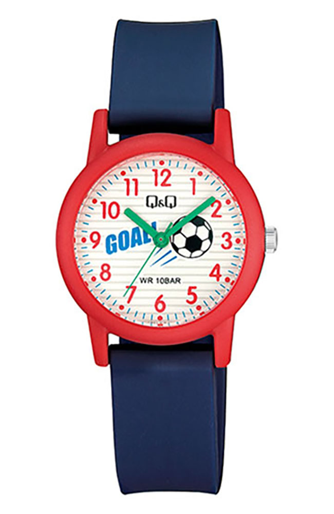 Παιδικό ρολόι χειρός Q&Q με λευκό καντράν και μπλε καουτσούκ λουράκι.
