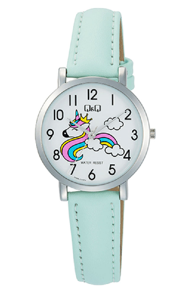 Παιδικό ρολόι χειρός Q&Q με λευκό καντράν και τιρκουάζ δερμάτινο λουράκι.
