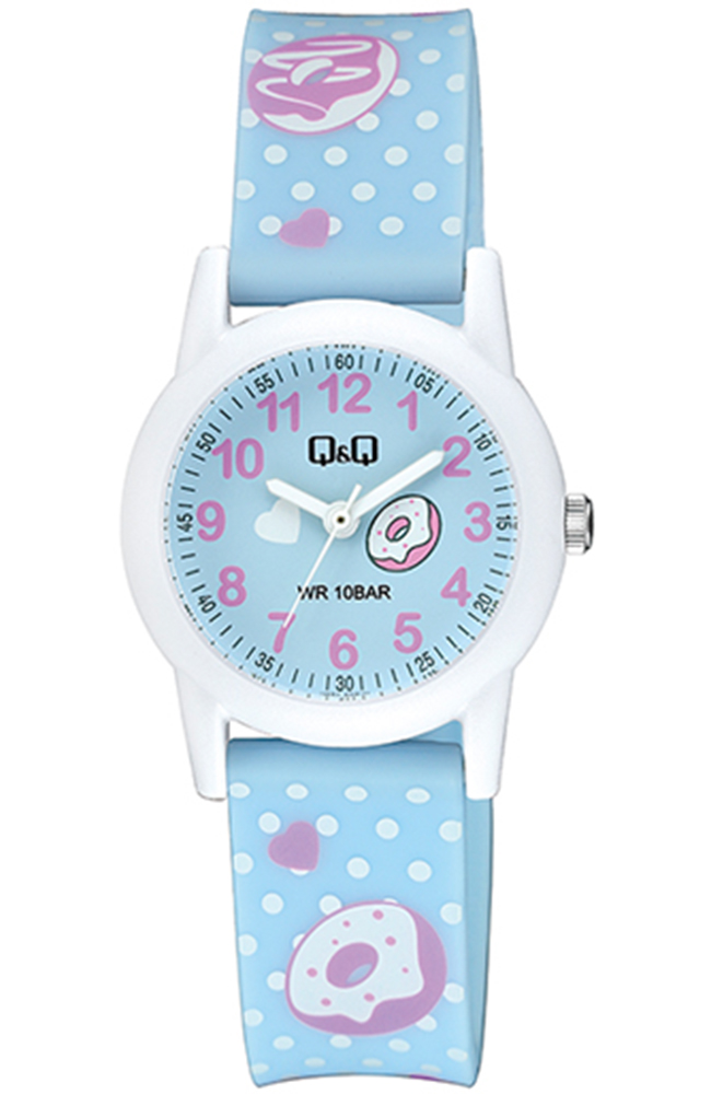 Παιδικό ρολόι χειρός Q&Q με γαλάζιο καντράν και δίχρωμο καουτσούκ λουράκι.