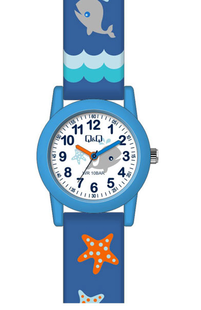 Παιδικό ρολόι χειρός Q&Q με λευκό καντράν και πολύχρωμο καουτσούκ λουράκι.