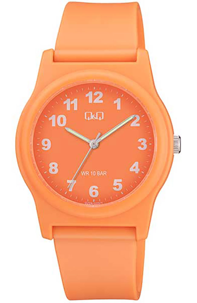 Γυναικείο ρολόι χειρός Q&Q με πορτοκαλί καντράν και πορτοκαλί πλαστικό λουράκι.