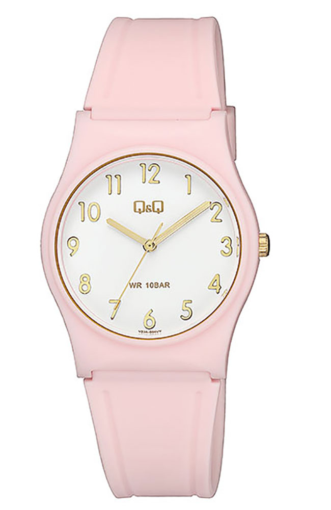 Γυναικείο ρολόι χειρός Q&Q με λευκό καντράν και ροζ καουτσούκ λουράκι.