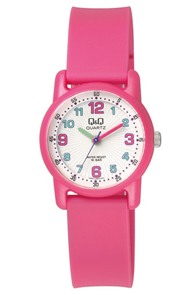 Παιδικό ρολόι χειρός Q&Q με λευκό καντράν και ροζ καουτσούκ λουράκι.
