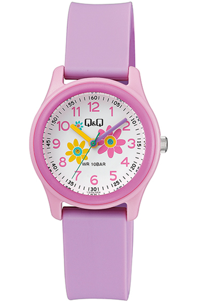 Παιδικό ρολόι χειρός Q&Q με λευκό καντράν και ροζ καουτσούκ λουράκι.