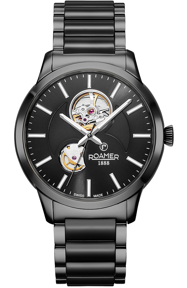 Ανδρικό ρολόι Roamer Ελβετικής κατασκευής από ανοξείδωτο ατσάλι με μαύρο καντράν και μπρασελέ.