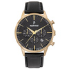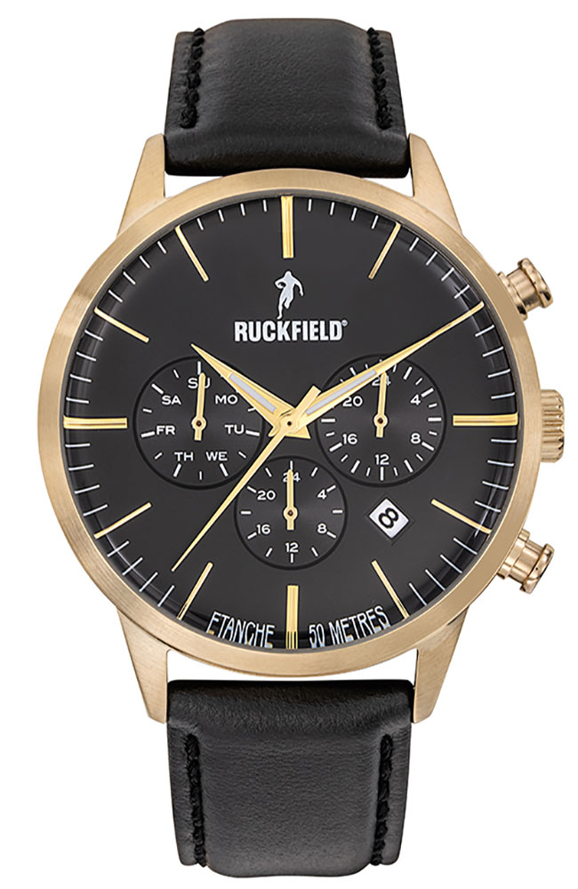 Ανδρικό ρολόι Ruckfield από επιχρυσωμένο ανοξείδωτο ατσάλι με μαύρο καντράν και μαύρο δερμάτινο λουράκι.