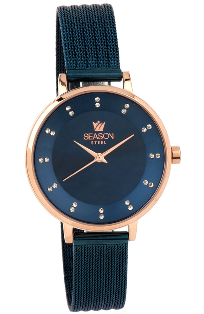 Γυναικείο ρολόι χειρός Season Time από ροζ επιχρυσωμένο ανοξείδωτο ατσάλι με μπλε καντράν, πέτρες ζιργκόν και μπρασελέ.