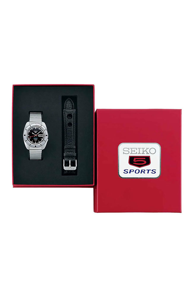 Ανδρικό ρολόι Seiko με αυτόματο μηχανισμό από ανοξείδωτο ατσάλι με μαύρο καντράν και ασημί μπρασελέ. Διατίθεται σε ειδική συσκευασία που περιλαμβάνει επιπλέον ένα μαύρο δερμάτινο λουράκι.