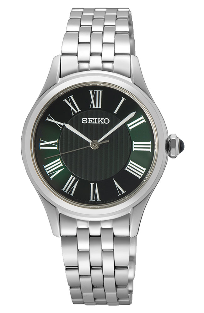 Γυναικείο ρολόι Seiko από ανοξείδωτο ατσάλι με πράσινο καντράν και ασημί μπρασελέ.