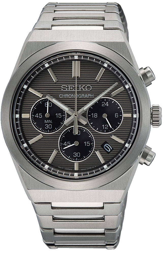 Ανδρικό ρολόι χρονογράφος Seiko από ανοξείδωτο ατσάλι με γκρι καντράν και ασημί μπρασελέ.