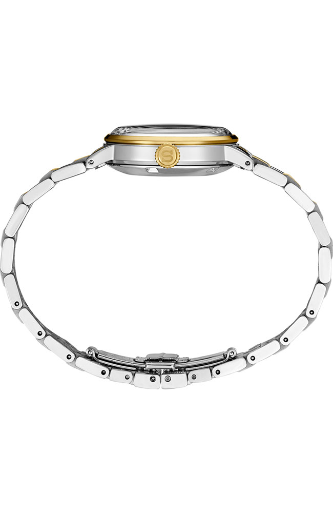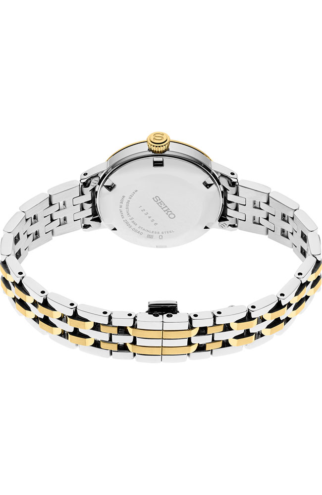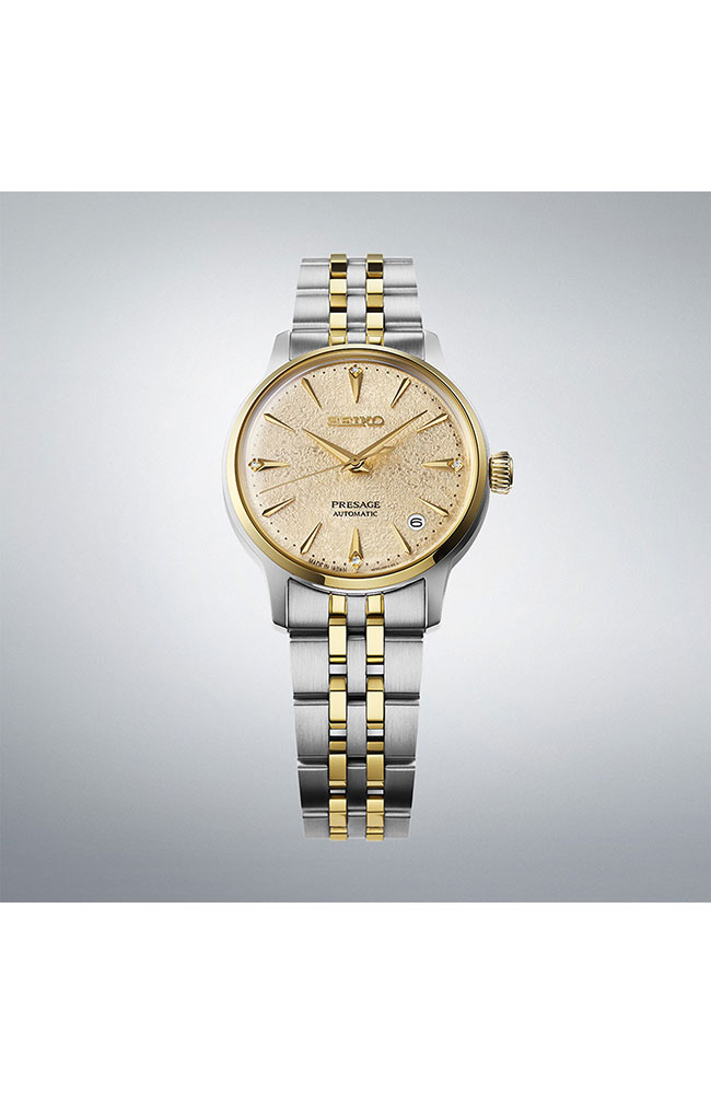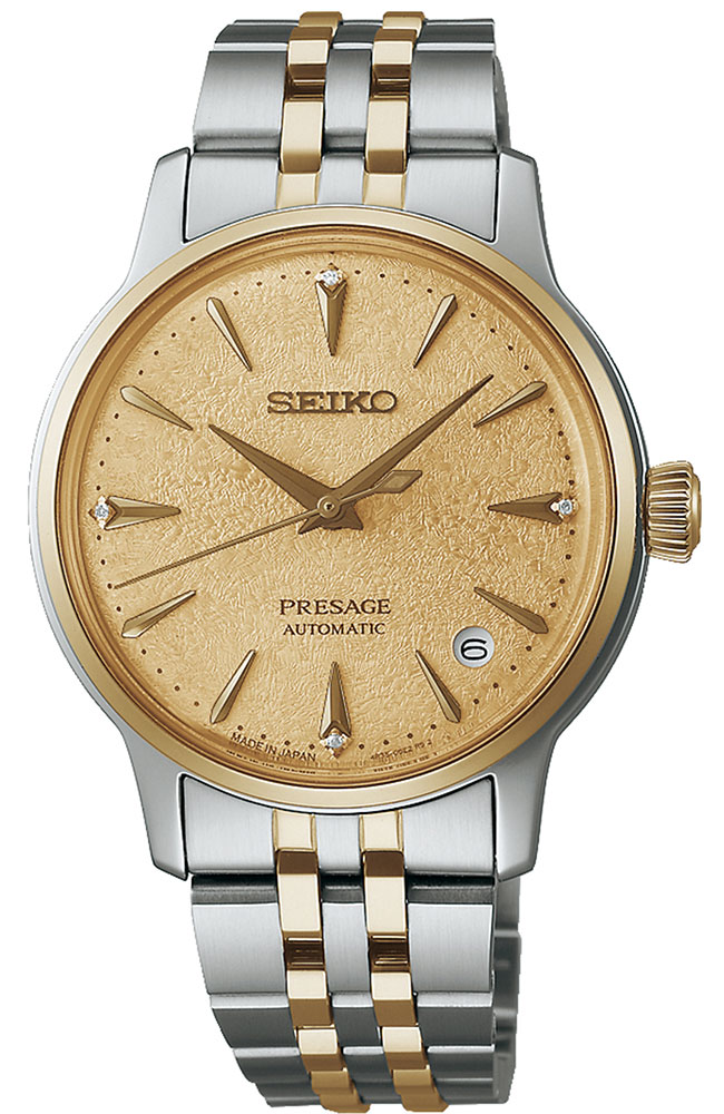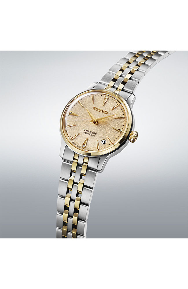 Γυναικείο ρολόι Seiko με αυτόματο μηχανισμό από ανοξείδωτο ατσάλι με χρυσό καντράν, με διαμάντια και μπρασελέ.